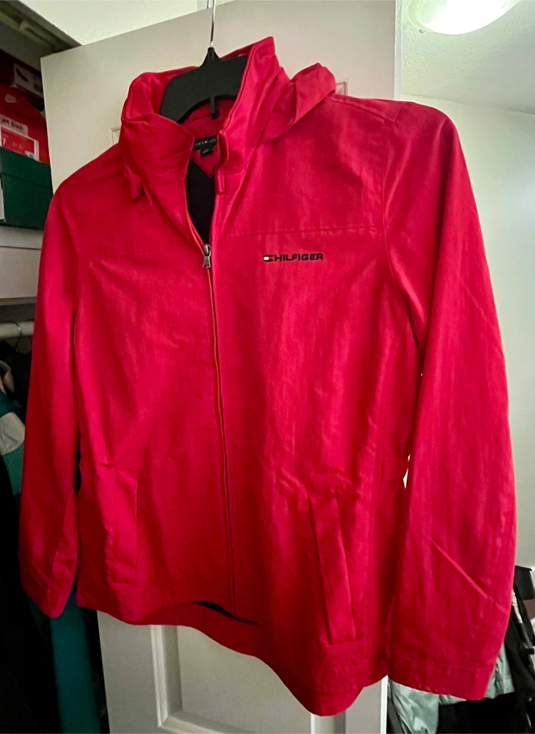 Tommy Hilfiger red jacket in size S/P. It has a hood and a zipper closure. The hood can be tucked in when not in use