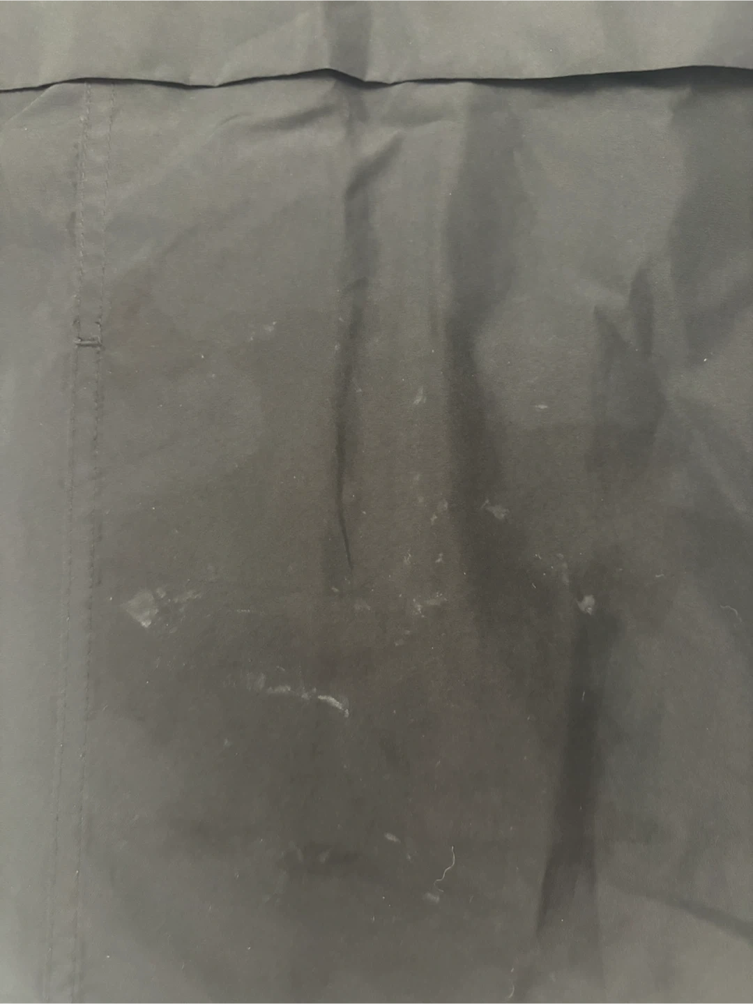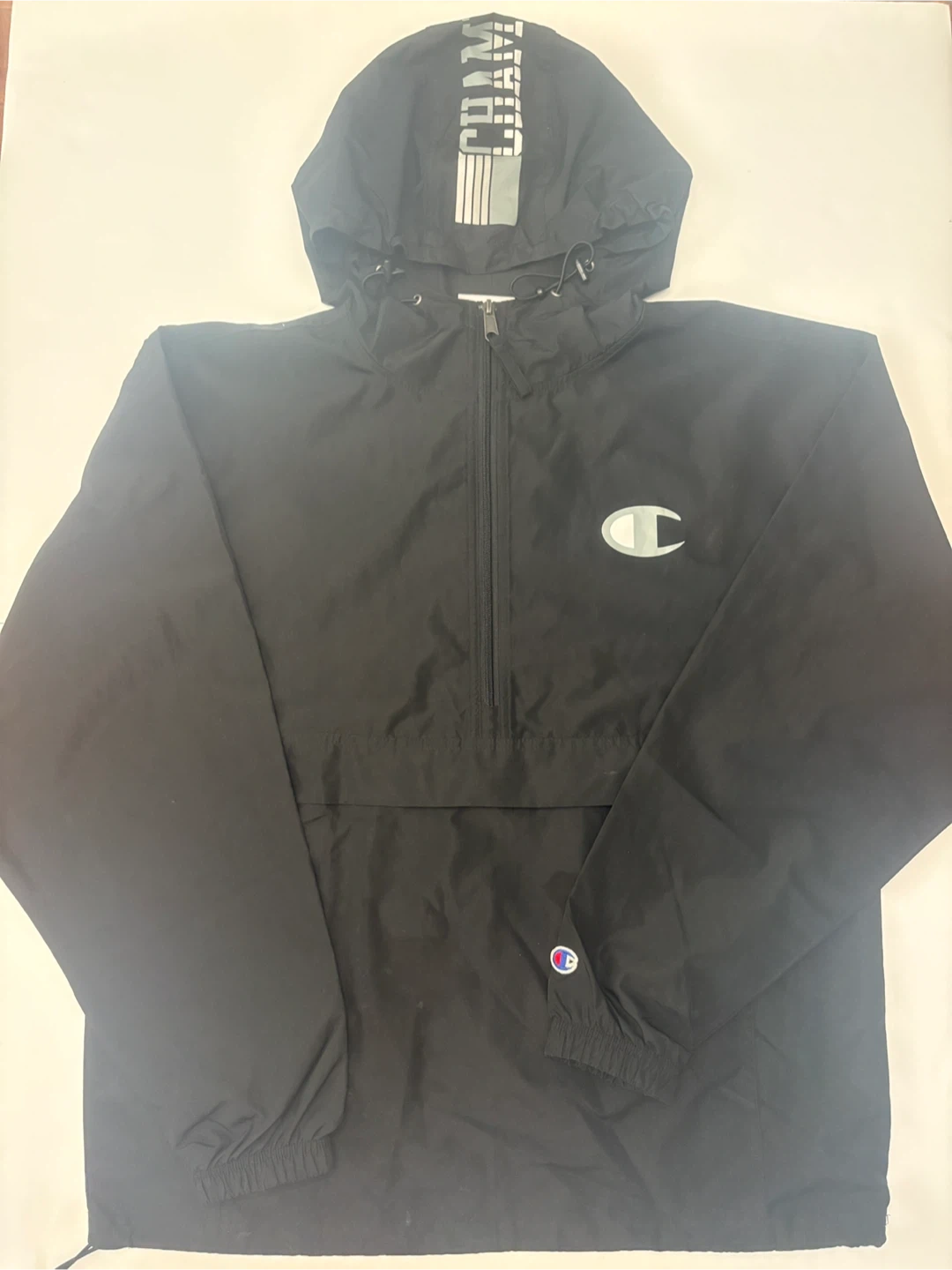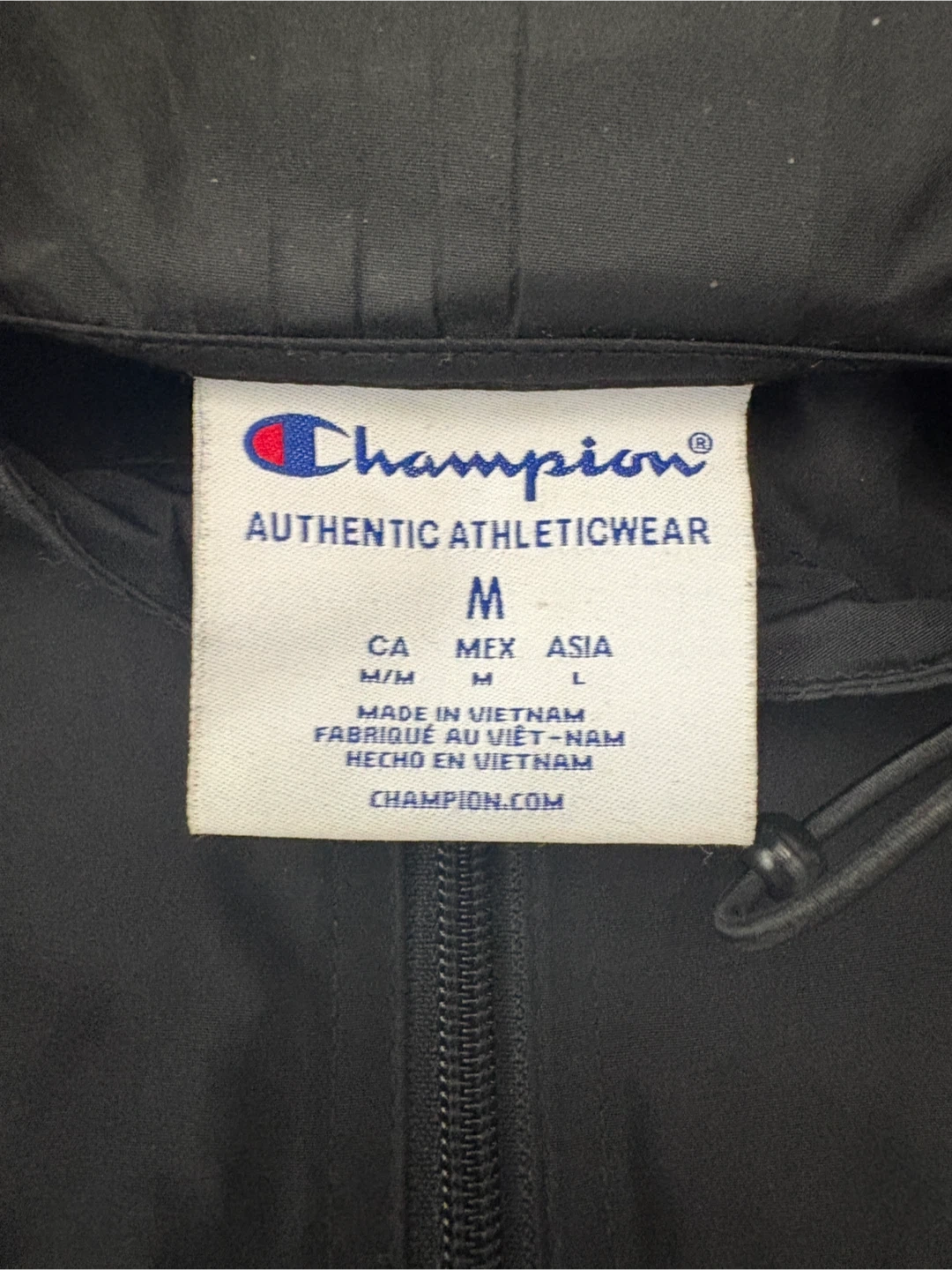 Selling a Champion black windbreaker jacket in size medium! It's got a handy hood and a quarter-zip design. Perfect for those breezy days or layering up. There are some marks on the front that might come out with a wash??, but it's still got lots of life left in it