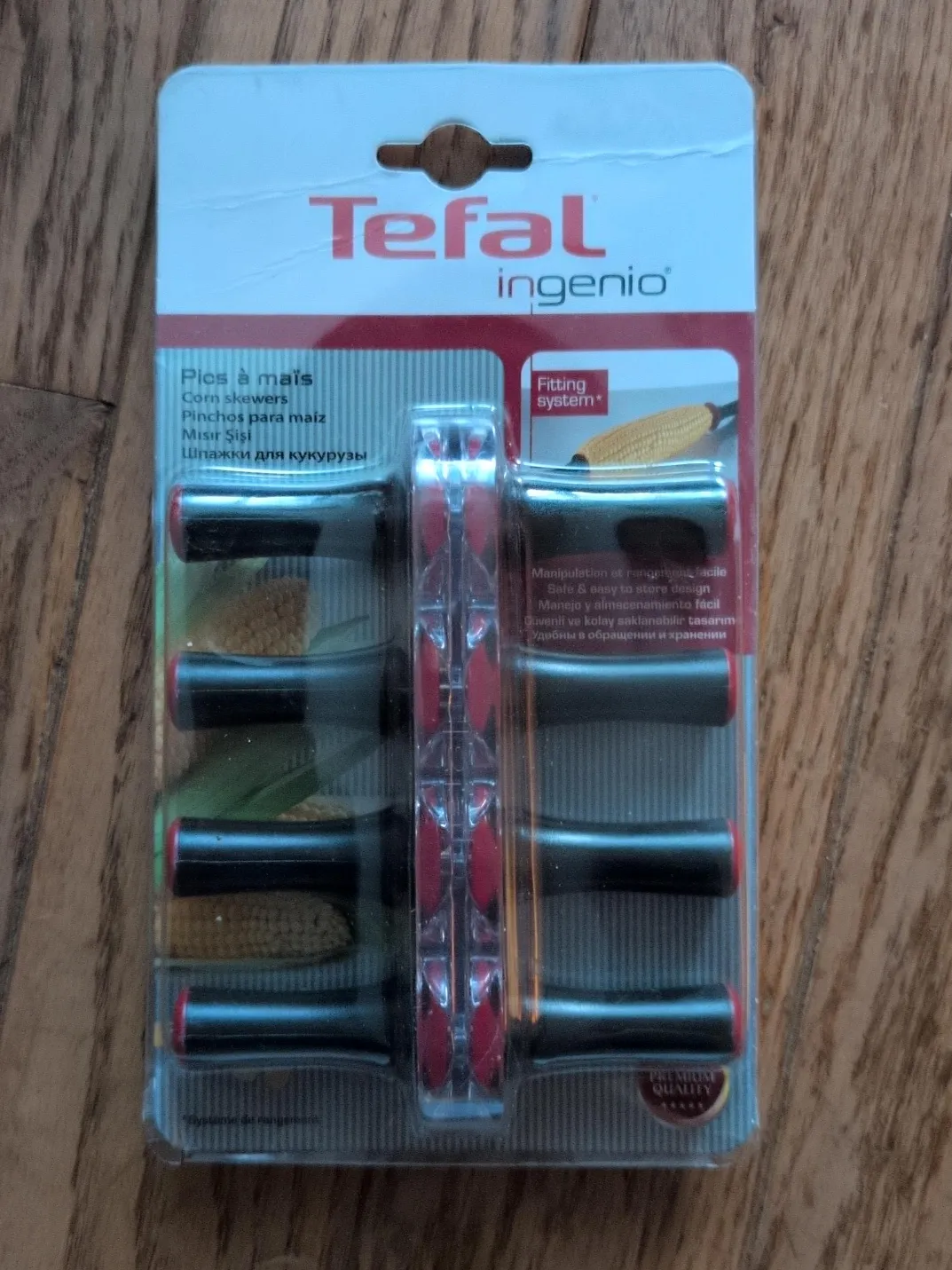 Selling a set of 8 Tefal Ingenio corn skewers, still in their original packaging! These skewers are designed to let you eat corn without burning your fingers. They're safe and easy to store, and dishwasher safe for easy cleanup. Enjoy your corn on the cob!