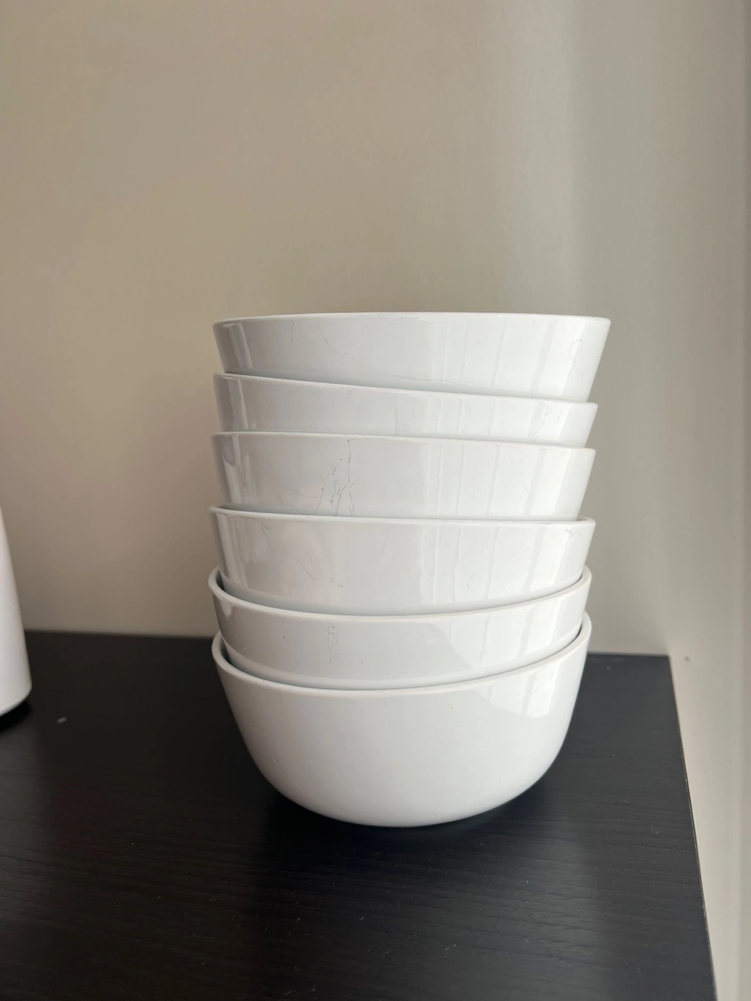 Selling a set of six white bowls. They're in good condition and perfect for everyday use! They would be great for cereal, soup, or snacks