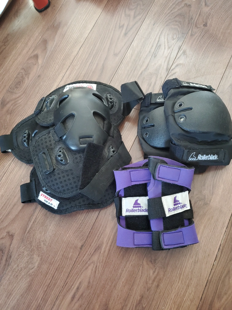 Selling a protective gear set that includes Rollerblade wrist guards (purple) and Rollerblade knee pads (black), along with Street Gear+ elbow pads (black). They're in good condition and ready to keep you safe!