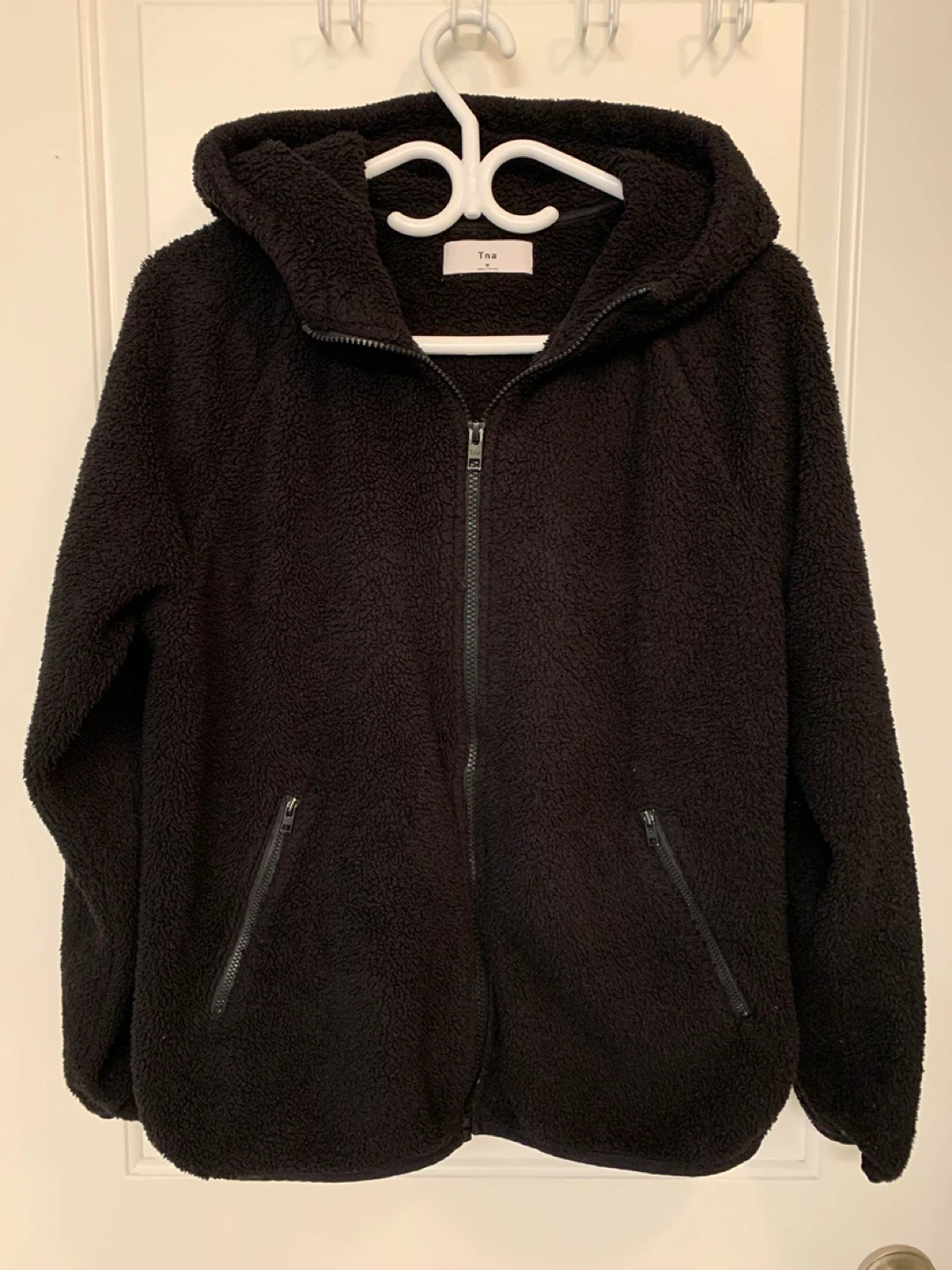 Cozy black fleece hoodie from TNA! It's in great condition and perfect for layering during those chilly Canadian evenings. It has a full zip and a hood to keep you warm and snug