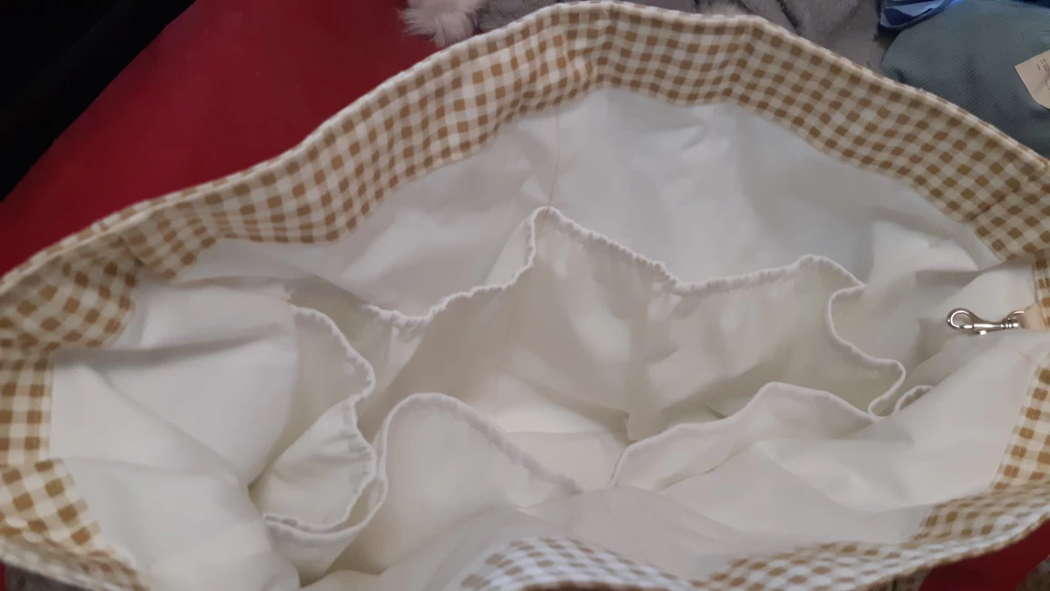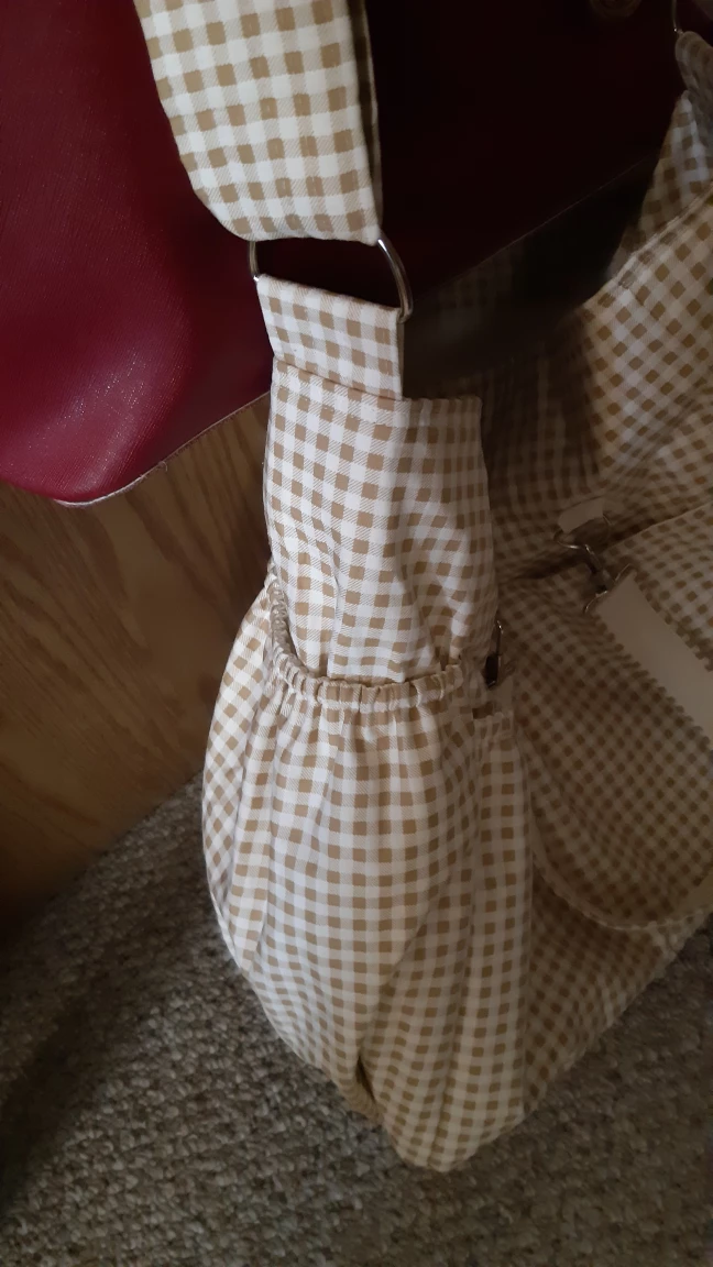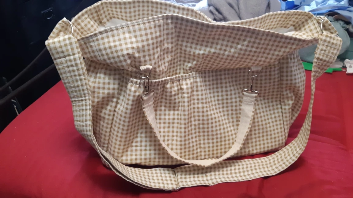This diaper bag features a charming gingham pattern in beige and white. It has multiple interior pockets for organization, perfect for keeping baby essentials tidy and accessible. It also includes a convenient shoulder and hand straps for easy carrying! could akso be used as an overnight bag for travel or the gym! It's in excellent condition! pickup location near Southgate mall