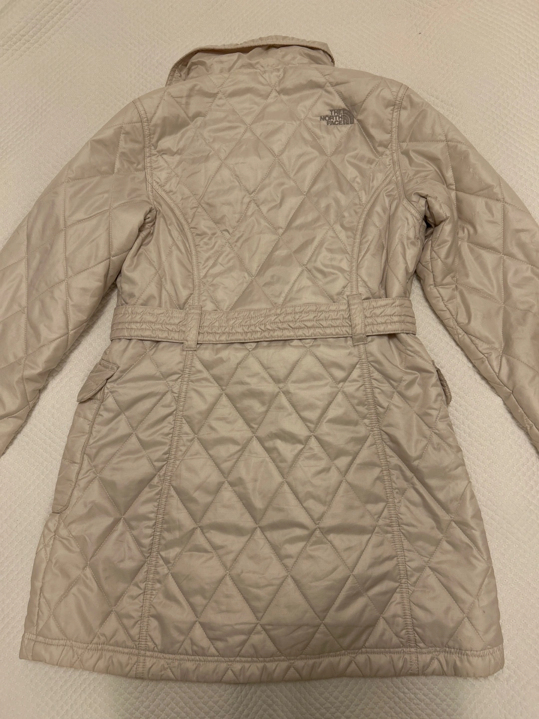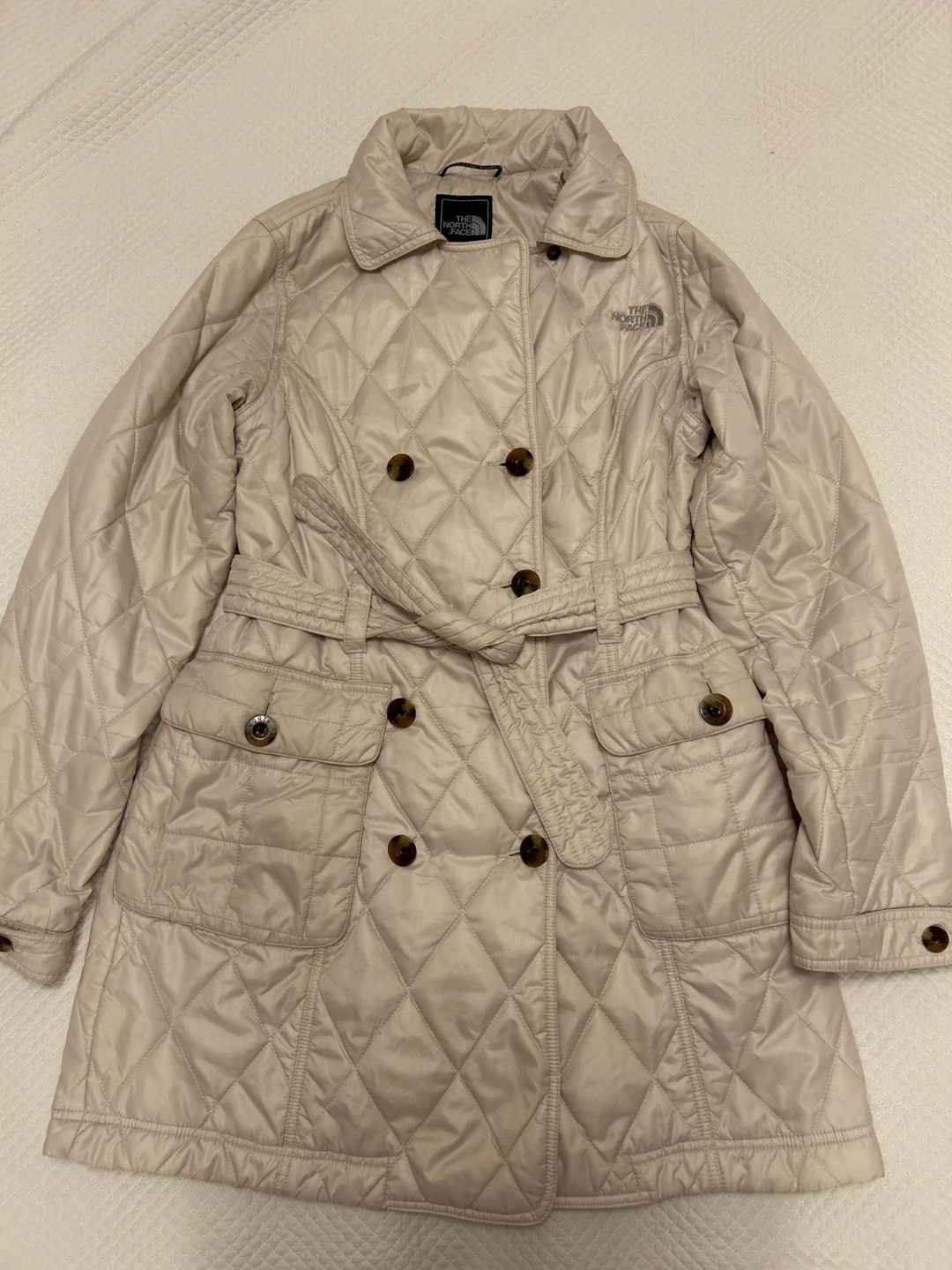 Selling a The North Face women's quilted jacket. It features a belted waist and a button-up front. The size is S (Small). It's in great condition and ready for a new home! Pit to pit: 18” length: 31”