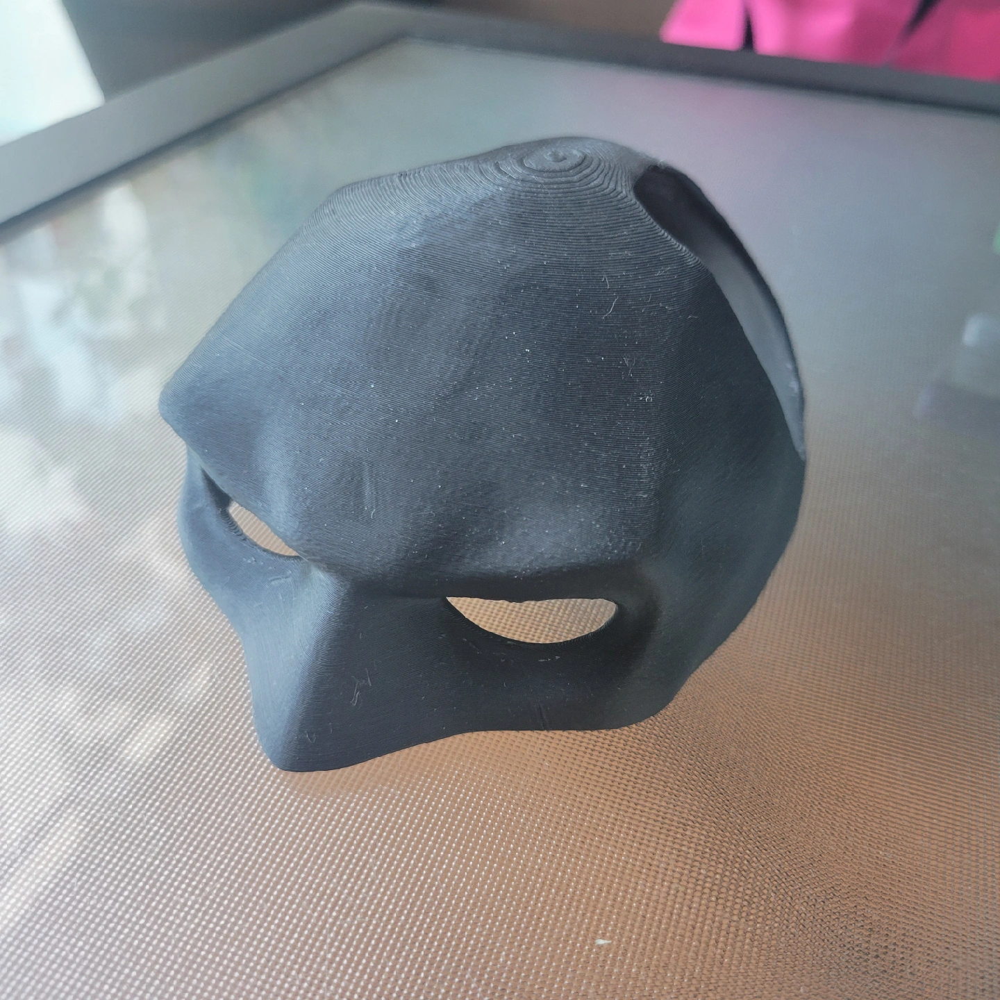 3d printed Batman mask for a large cat or small dog. Too large for my tabby otherwise, she would be Batman. It's 3 3/4 inches wide and 4 1/4 inches long.
