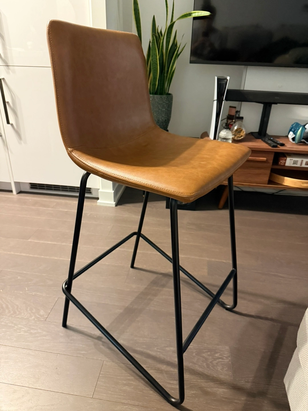 Selling a stylish bar stool with a tan faux leather seat and black metal legs. It's in great condition and would look great in any kitchen or bar area! Moving sale. The price reflects all three for $150