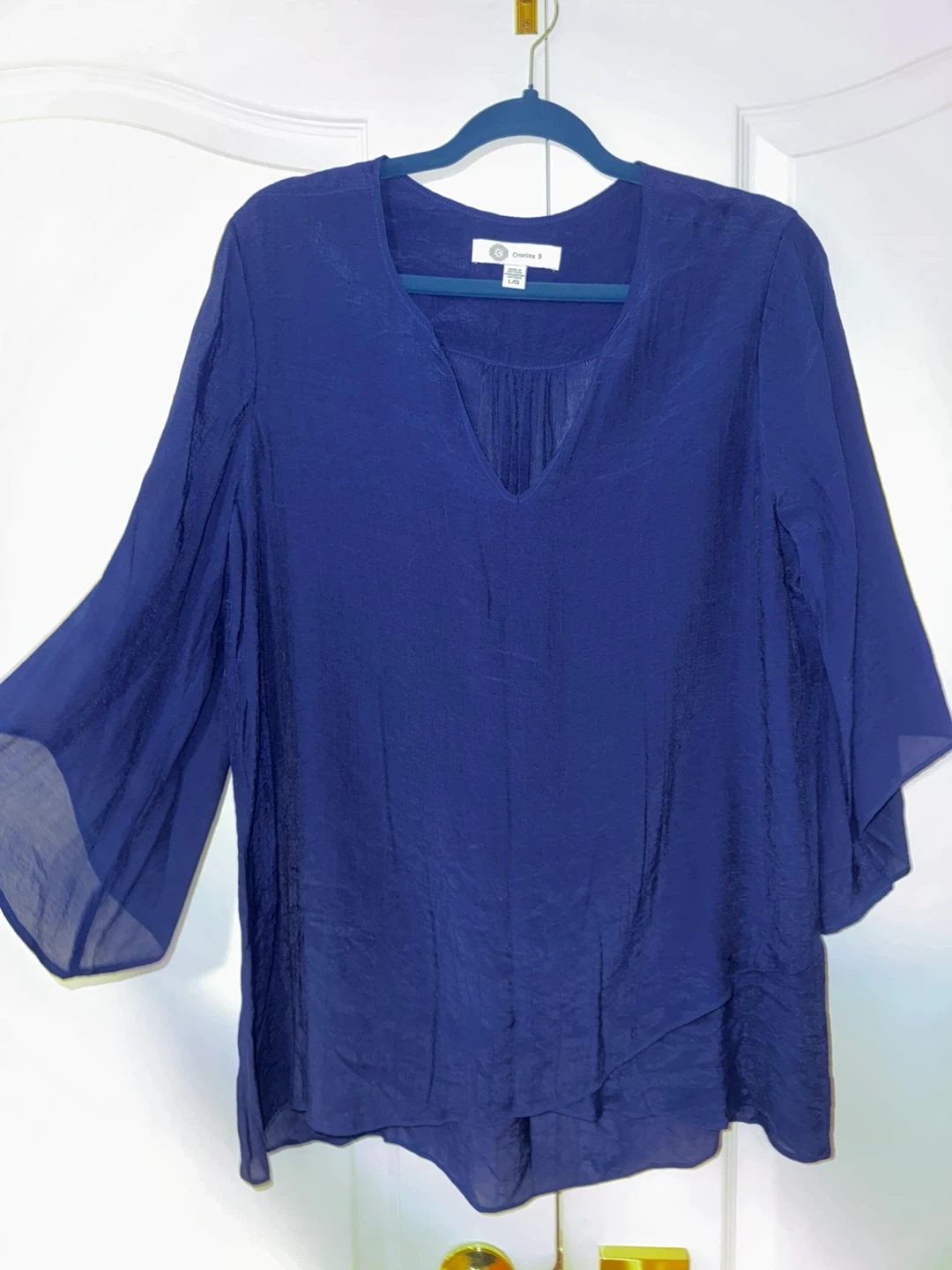 Selling a beautiful blue tunic by Cristina B in size L. It has a flattering V-neck and flowy sleeves. Perfect for dressing up or down!
