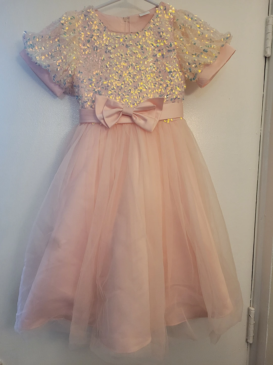 The dress is beautifully embellished with tonal sequins scattered across the bodice. Intricately designed with tulle trims around the neck and waistline. multi-layered, frothy tulle skirt, adding an elegant texture. Dress her up in this beauty for all occasions.