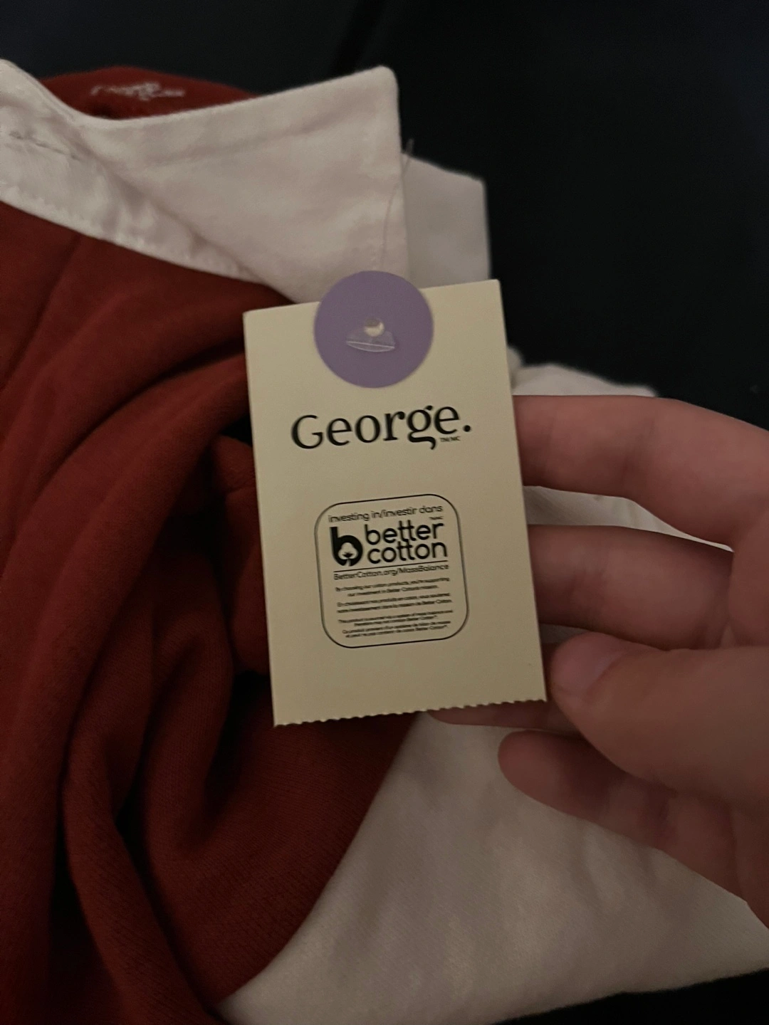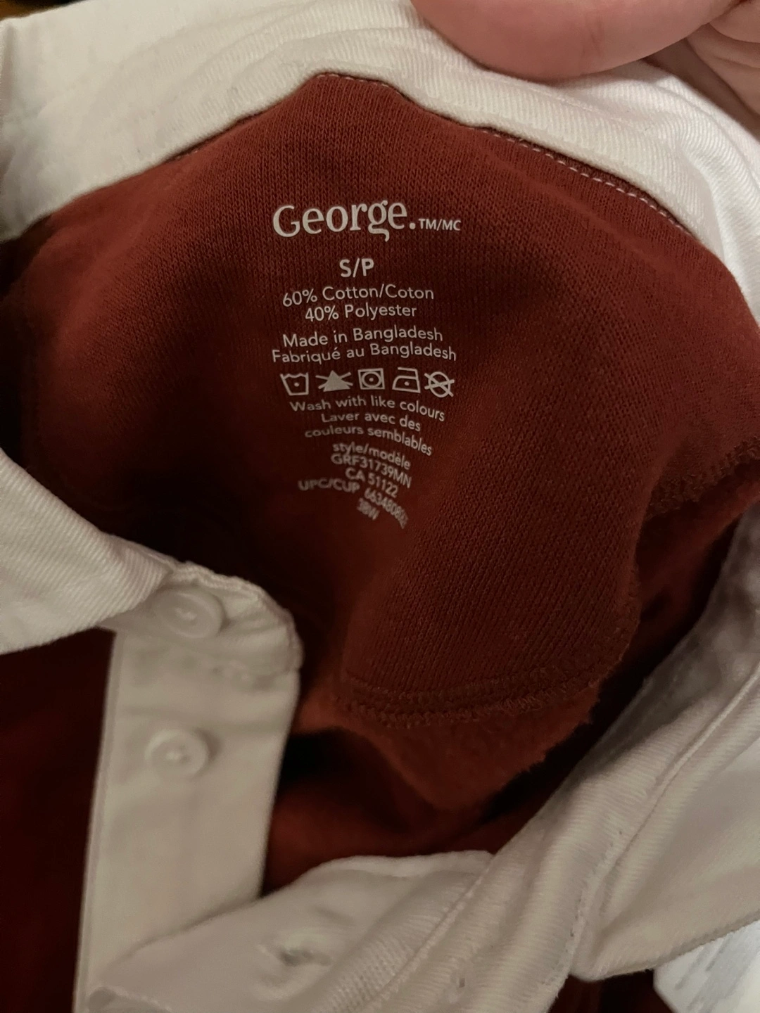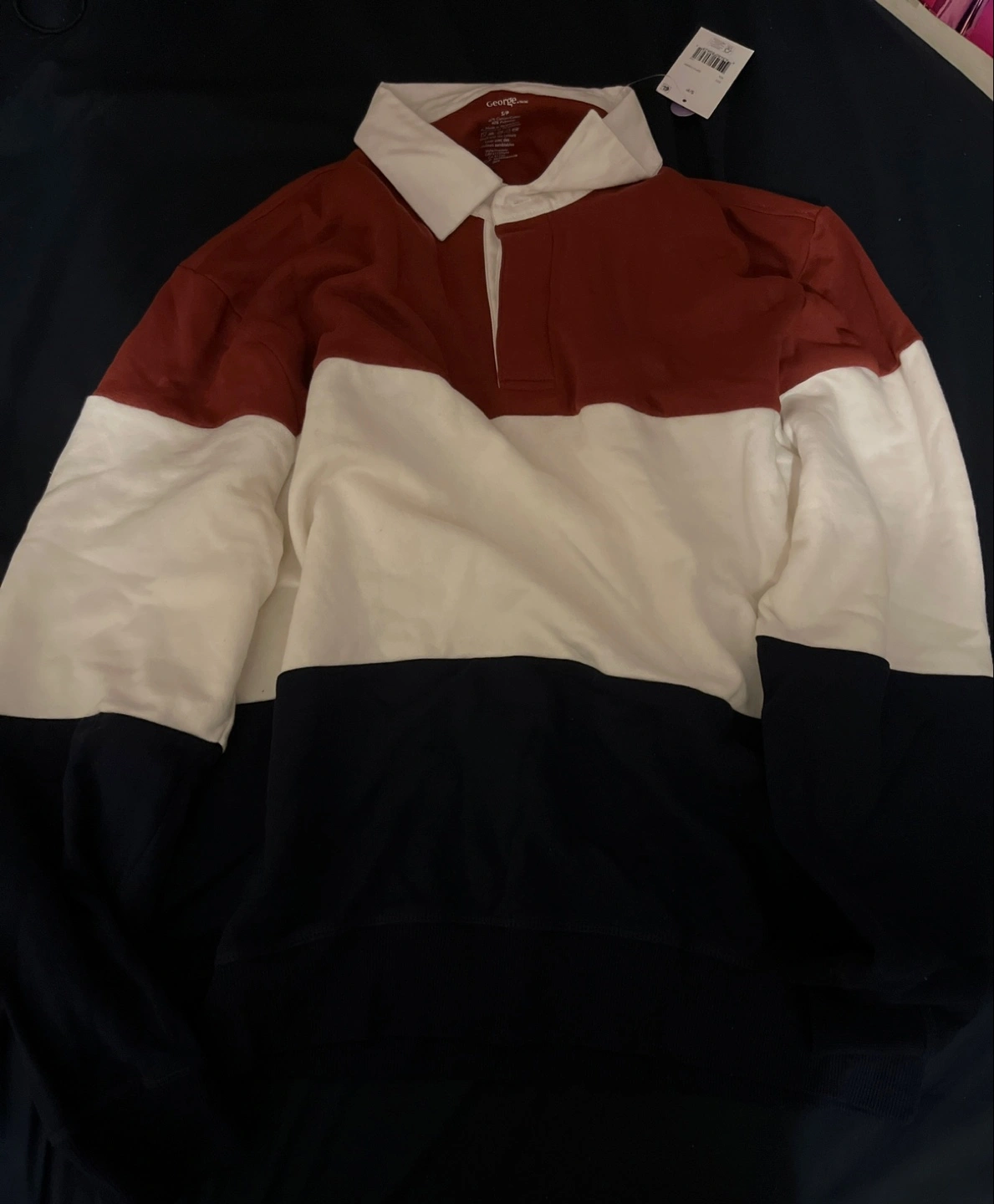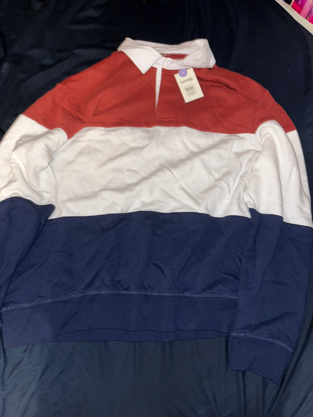 Cozy George rugby long sleeve shirt! Never worn, still has tag on it. Size S/P with a design in red, white, and navy. Made from a 60% cotton and 40% polyester blend.
