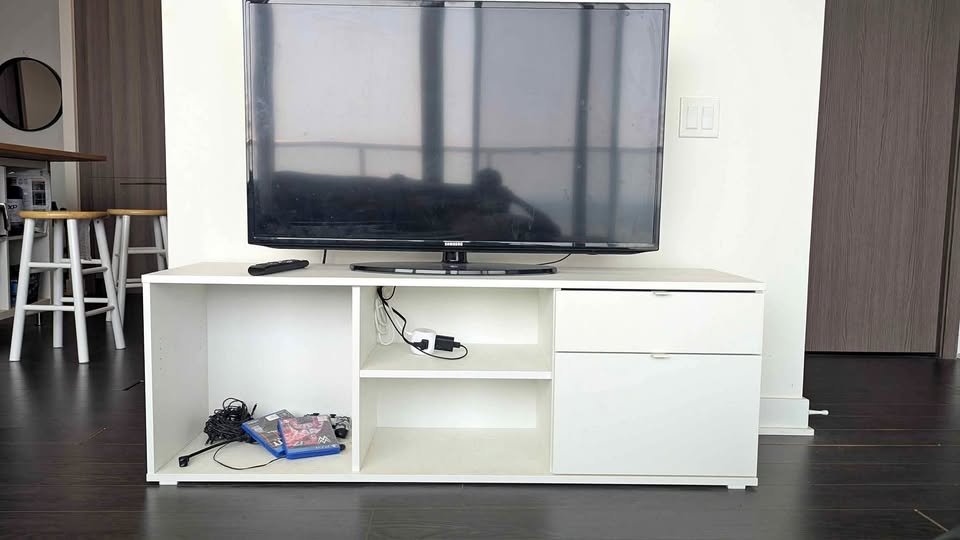 White TV bench/stand with two drawers and adjustable shelves (2nd shelf is present but not shown in picture).