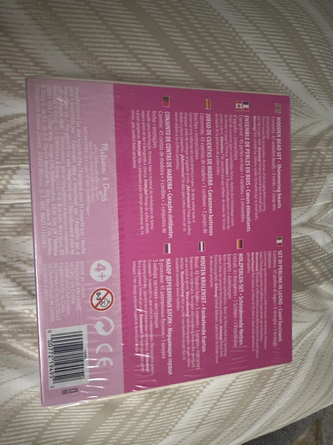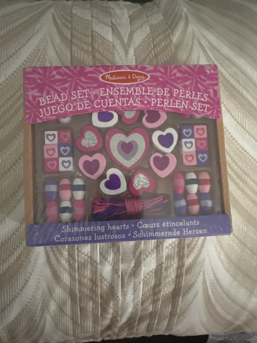 This Melissa & Doug Bead Set features shimmering hearts! It's perfect for kids aged 4 and up. The set includes 45 wooden beads and 3 cords for creating beautiful necklaces and bracelets. It's a great way to encourage creativity and fine motor skills