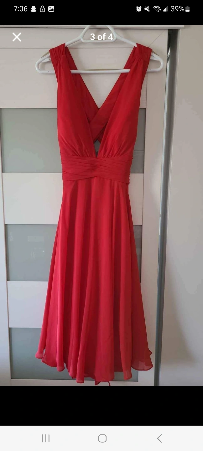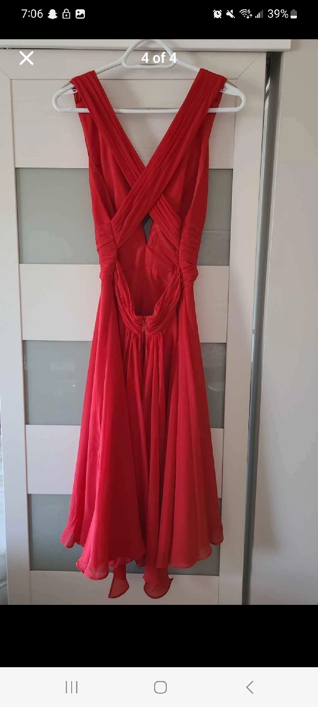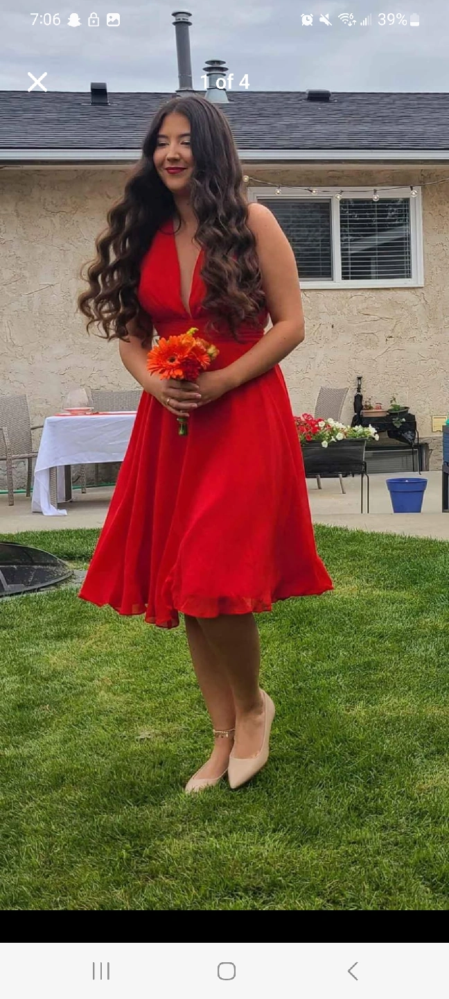 15Selling a beautiful red chiffon dress! It's in great condition and would be perfect for a special occasion. The dress features a flattering design with a V-neck and a flowing skirt. It's lightweight and comfortable to wear. Feel free to message me with any questions! Size 4
