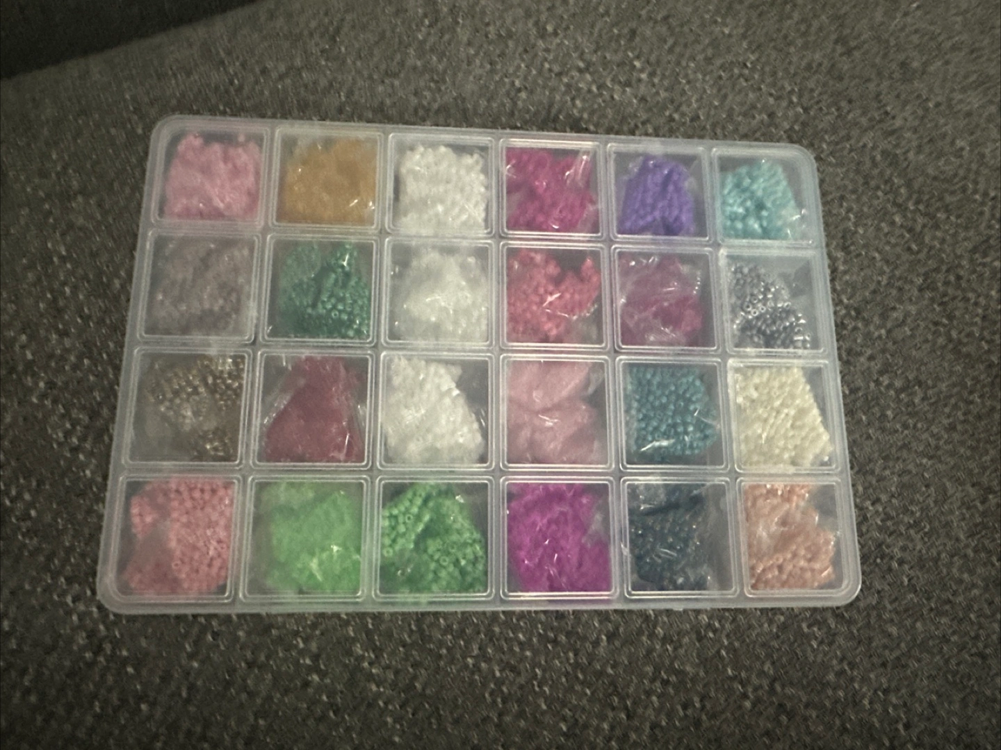 I'm selling a clear plastic organizer box filled with a variety of colourful beads. The beads are separated into individual compartments, making it easy to keep them organized for your crafting projects. There are many different colors and types of beads included!