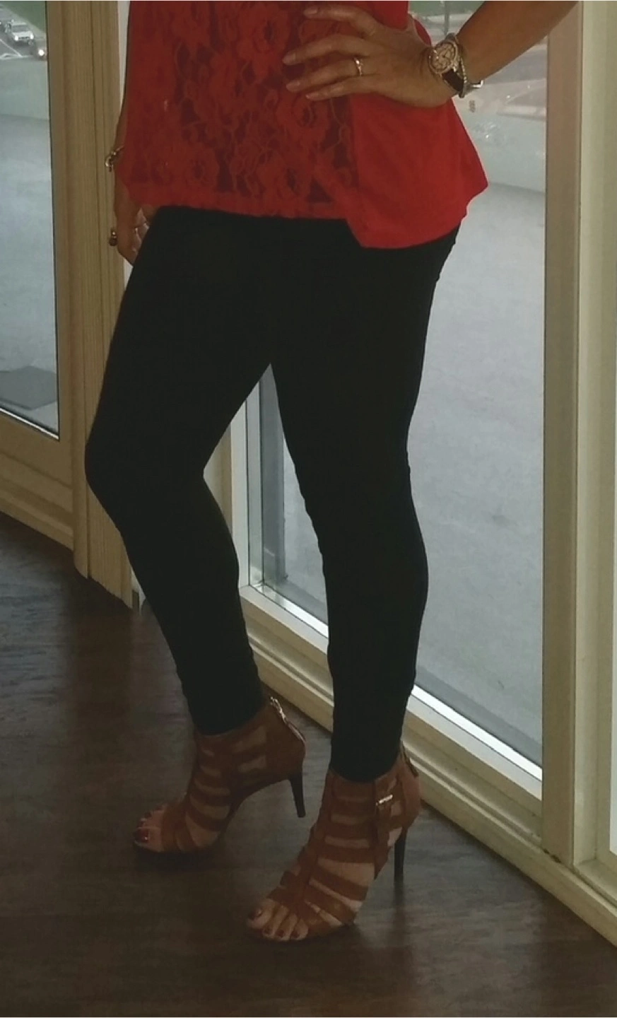Denim shorts & sleeveless lace top (M) & Bag & Leggings (M)