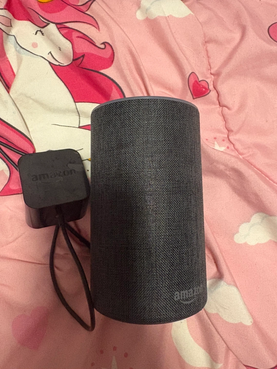 This is an Amazon Echo (2nd Gen) smart speaker. It's a charcoal-coloured cylinder with a fabric finish. It comes with the power adapter.