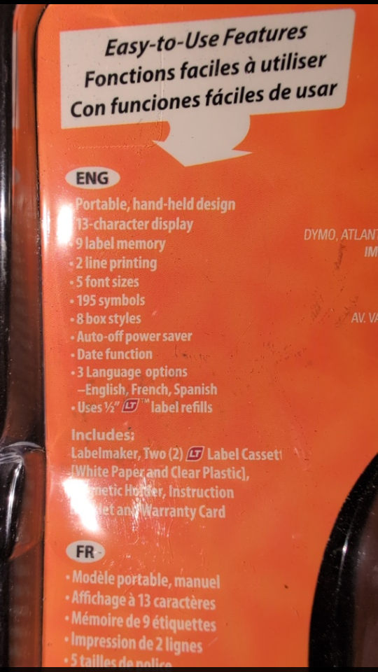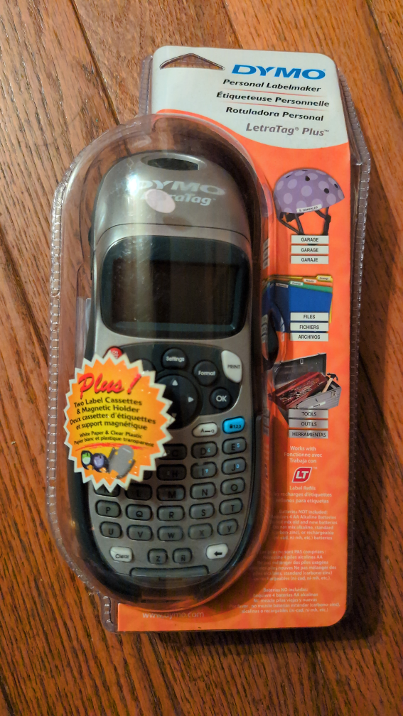 I'm selling a brand new DYMO LetraTag Plus personal labelmaker! It features a portable, hand-held design with a 13-character display and 2-line printing. It also has 5 font sizes, 195 symbols, and 8 box styles. The box includes the labelmaker, two label cassettes (white paper and clear plastic), a magnetic holder, instruction manual, and a warranty card.