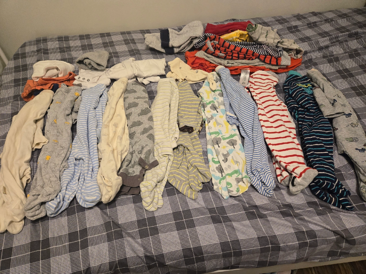 A bundle of baby new born and 0-3 months footed pajamas and onesie. Also bundle of various clothes for 18 months old.