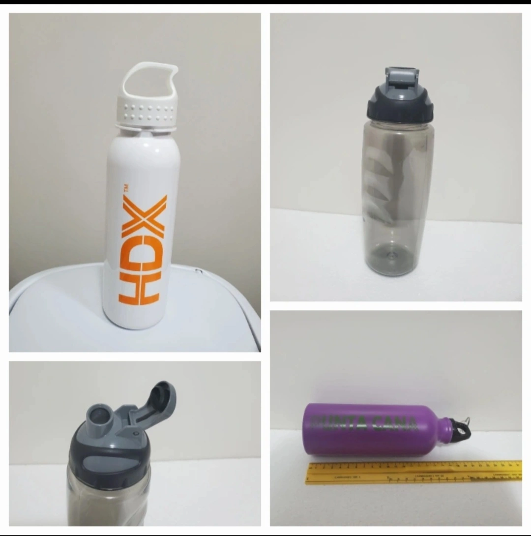 I have a few water bottles for sale! There's an HDX bottle, a grey water bottle, and a purple water bottle available. * Purple one is new, stainless steel. Says "PUNTA CANA" * Grey one is plastic, used once to store liquid, not to drink from. * White one is durable plastic.