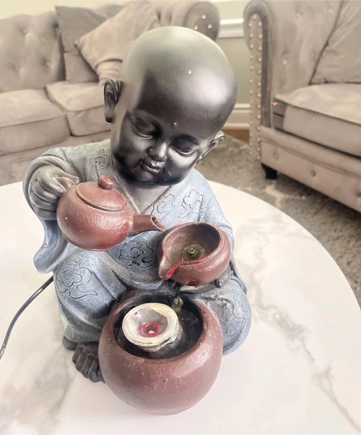 10This is a cute monk water fountain. It is in great condition and ready for a new home! It features a little monk pouring water into a bowl. The fountain is brown, black, and grey.
