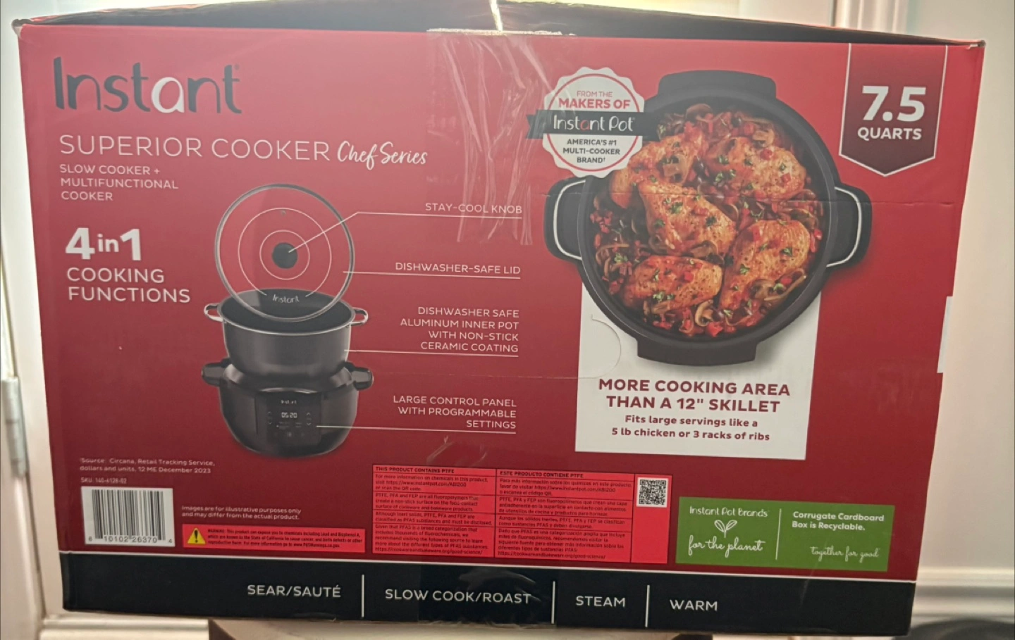 I'm selling a brand new Instant Superior Cooker Chef Series. This is a 4-in-1 cooker with 7.5 quarts capacity. It functions as a slow cooker and a multifunctional cooker. It's designed for true one-pot cooking, allowing you to sauté, slow cook, steam, warm, and more. It replaces eight cooking appliances and tools, including a slow cooker, steamer, sauté pan, saucier, warmer, roaster, braiser, and non-stick pot. The box is included!