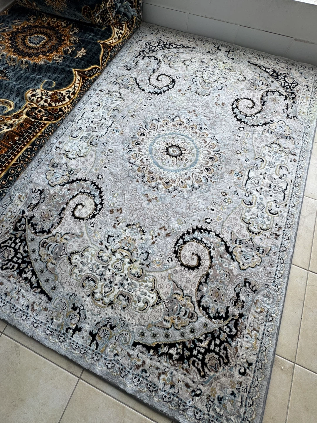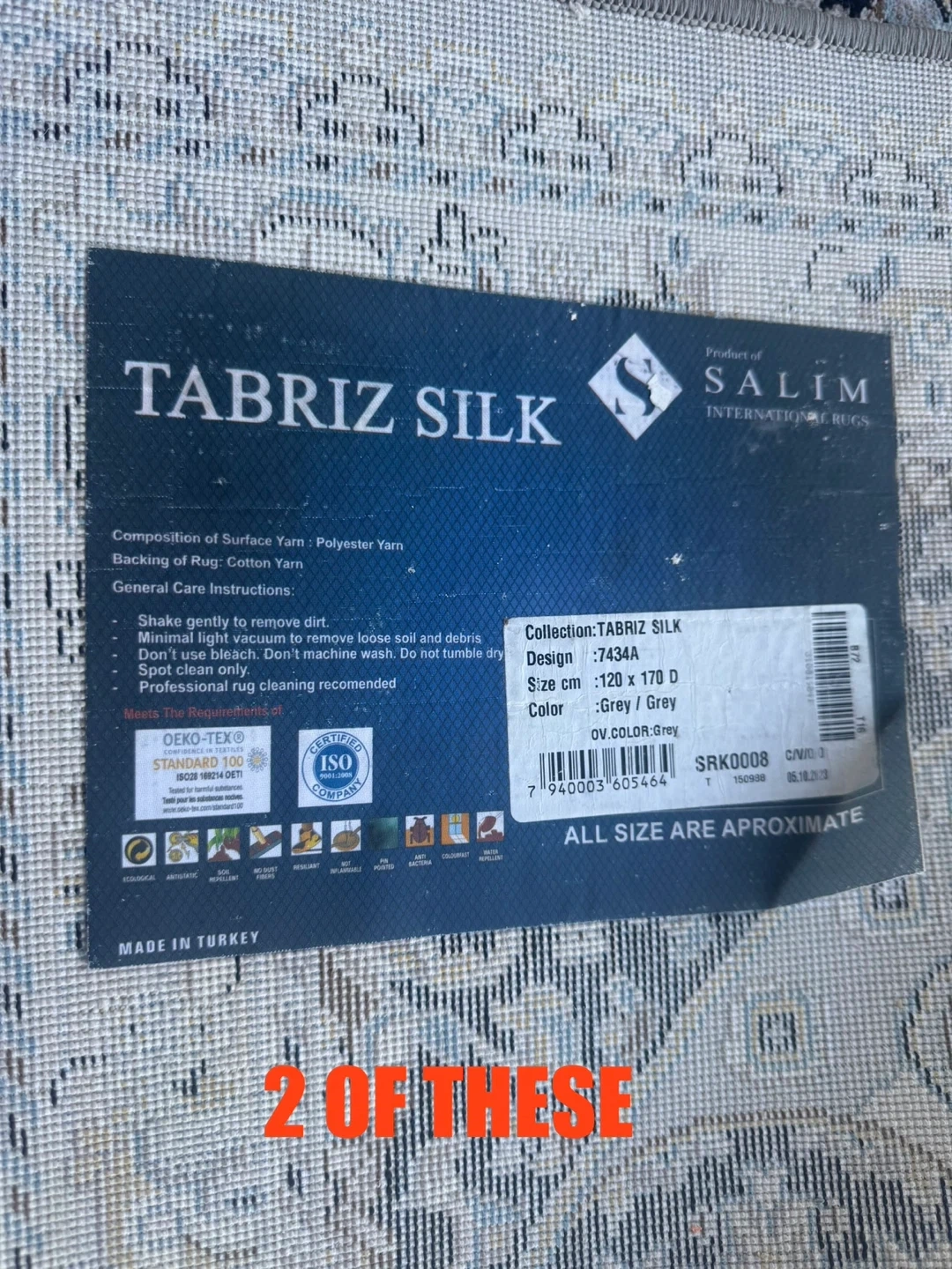 10Selling a beautiful Tabriz Silk rug in grey! It's sized at 120 cm x 170 cm. The backing of the rug is made of cotton yarn, and the surface composition is polyester yarn. It's also made in Turkey! 2 rugs included both the same size take both for $180