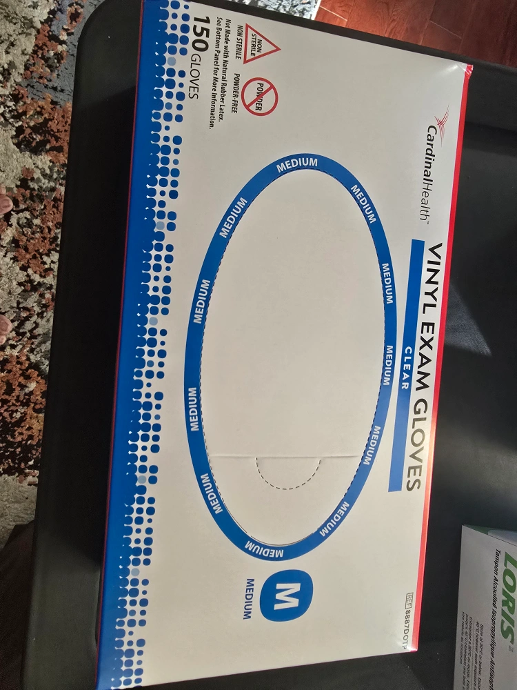 38Selling a box of Cardinal Health Vinyl Exam Gloves. These are clear, powder-free, and non-sterile. Size medium, 150 gloves in the box