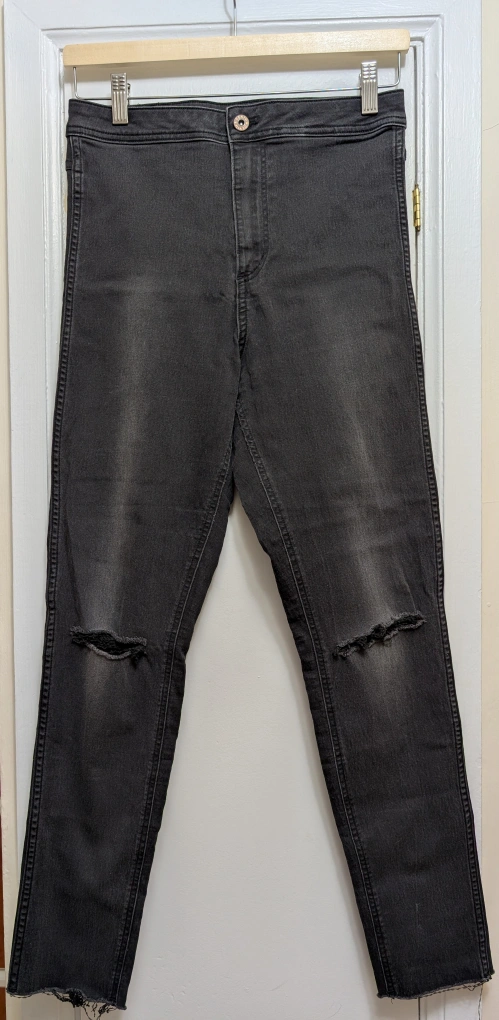 Selling a pair of H&M black denim jeans. They have a waist size of approximately 28 inches, Hip 30 inches and a length of about 27 inches. There are rips at the knees and a frayed hem, giving them a stylish, worn look! High Waist Ankle Skinny CA 30 Distressed Look Pick up by Keele and Rogers