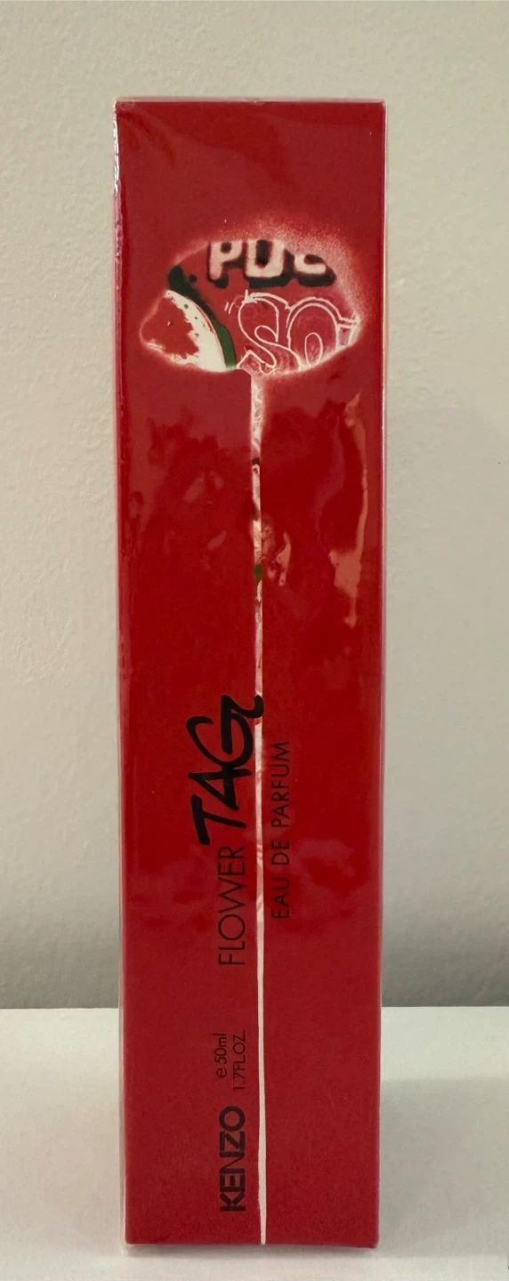 Selling a bottle of Kenzo Flower Tag Eau de Parfum. It's a 50ml bottle in a red box. The scent is a natural spray. Made in France.