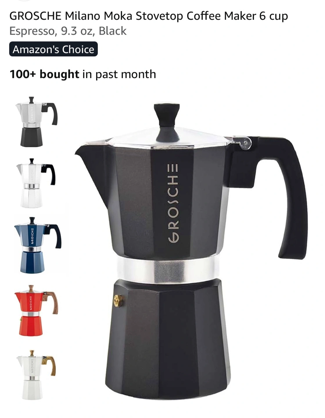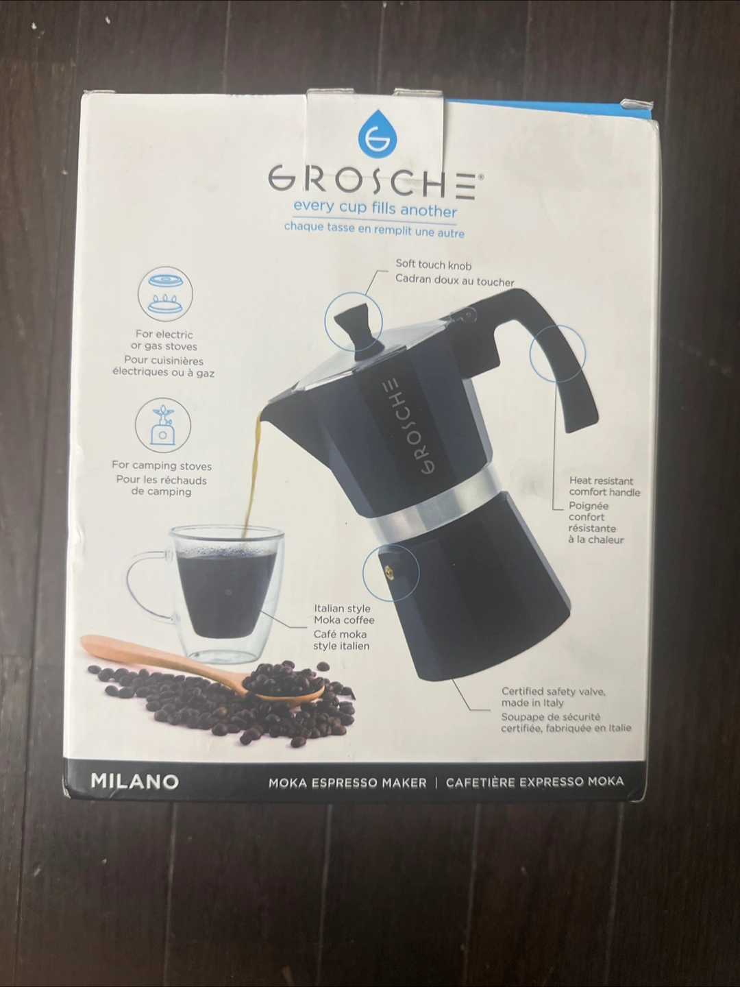 Grosche Milano Moka stovetop coffee maker, perfect for making espresso at home or while camping! This one makes 6 cups and is in black. It works on electric or gas stoves. Every cup fills another!