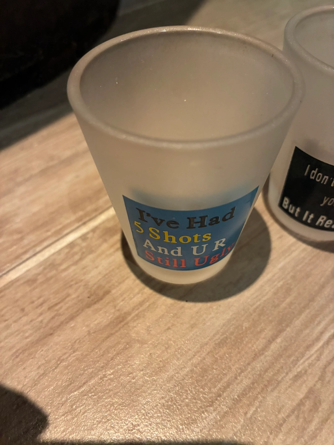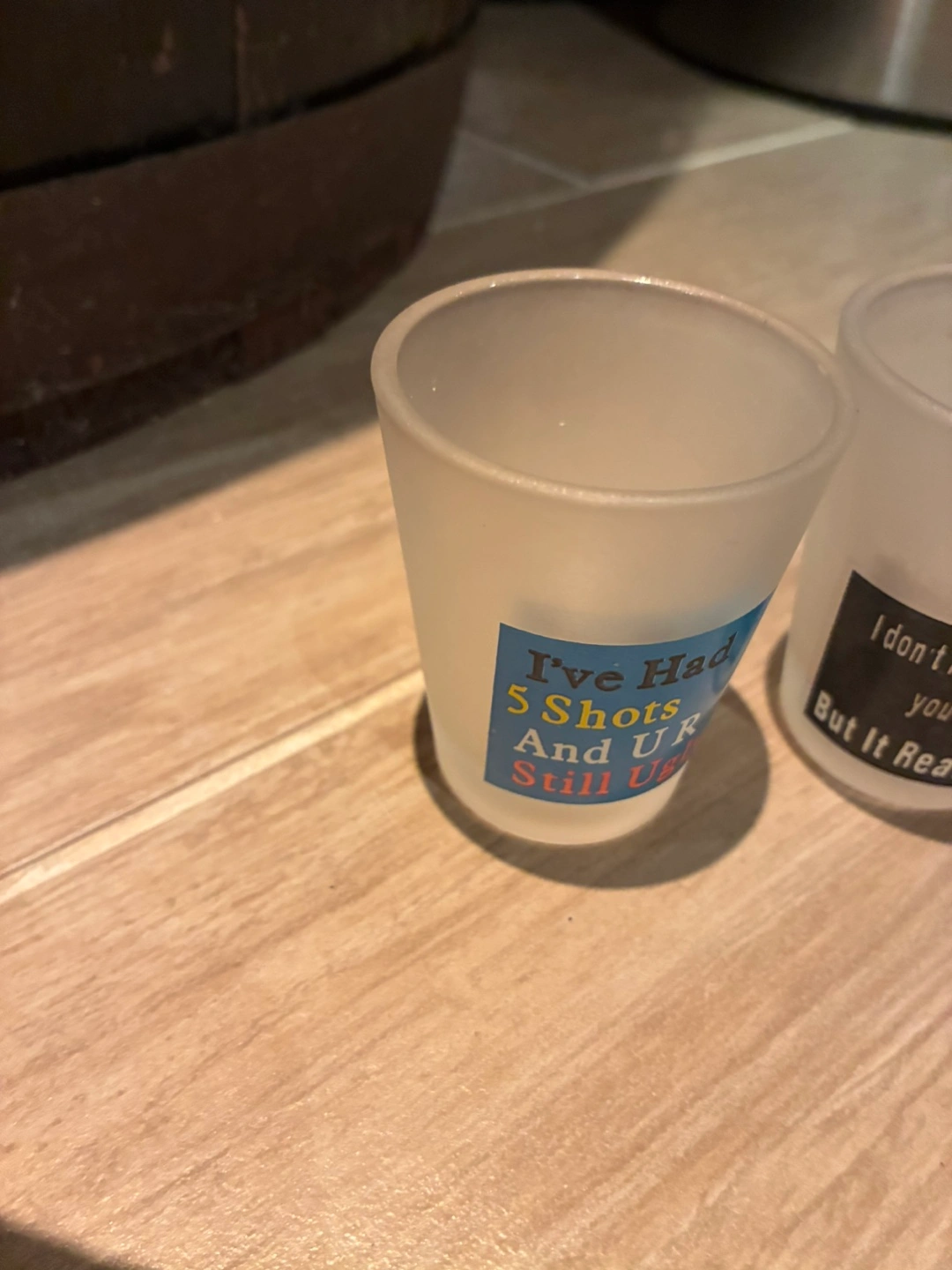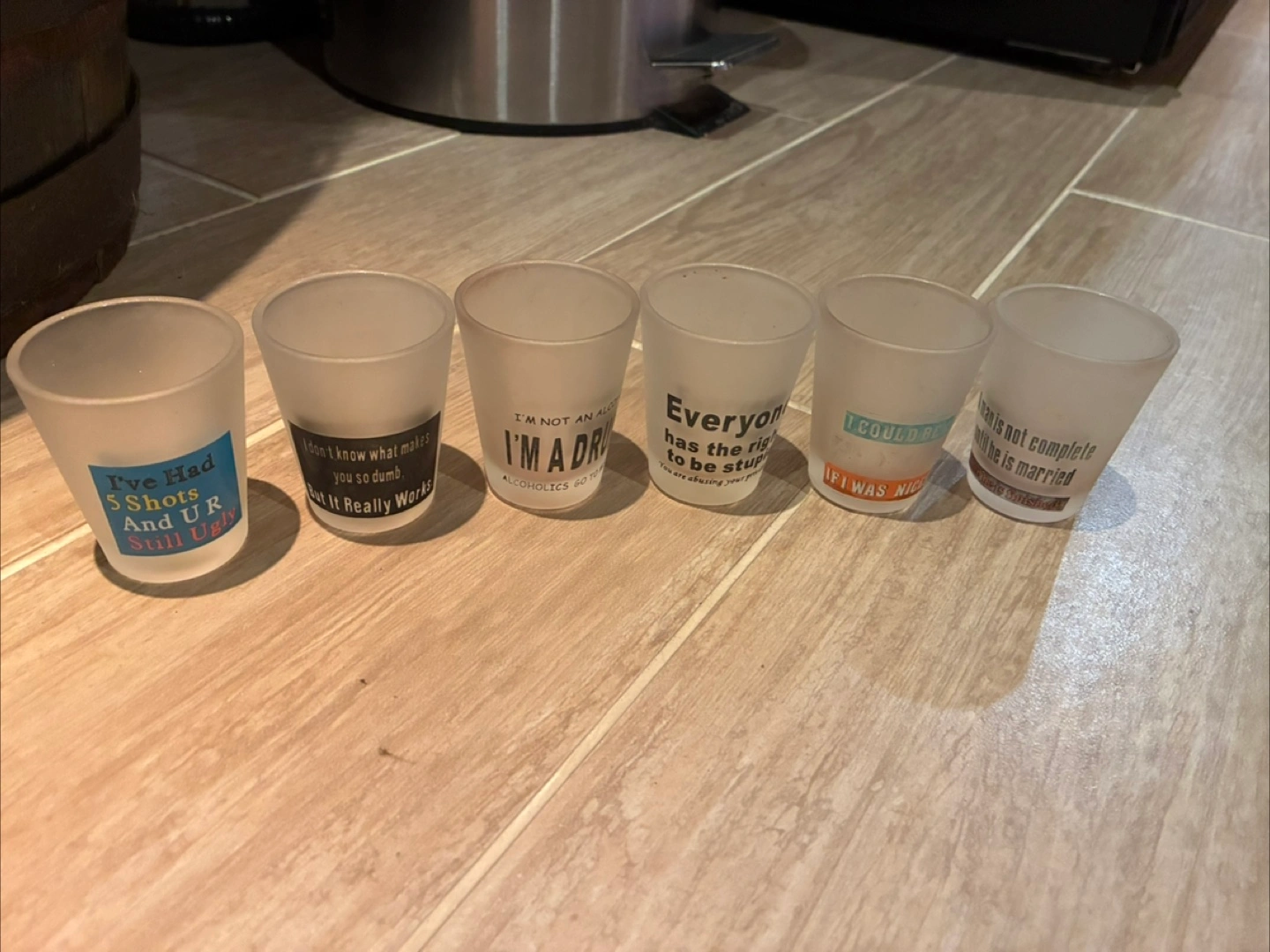 Selling a set of shot glasses with various funny sayings printed on them. They're perfect for parties or adding a bit of humour to your home bar