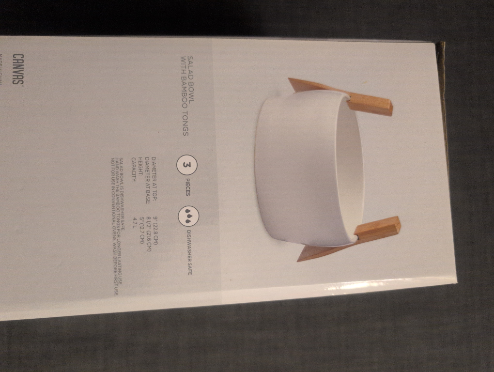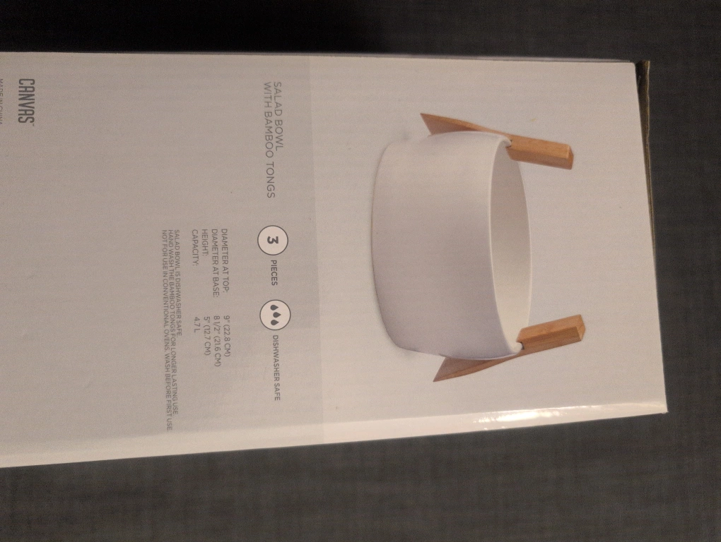Selling a brand new Canvas salad bowl with bamboo tongs! It's still in the box and has never been used. This set includes 3 pieces: the bowl and two bamboo tongs. The bowl is dishwasher safe and has a diameter of 9" (22.8 cm) at the top and 5" (12.7 cm) at the base. A lovely addition to any kitchen!