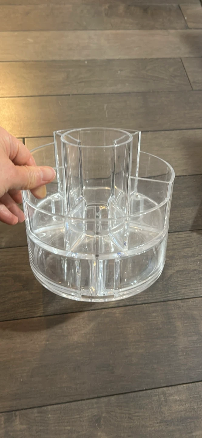 Clear acrylic makeup organizer. It's in great condition and perfect for keeping all your cosmetics neatly organized!