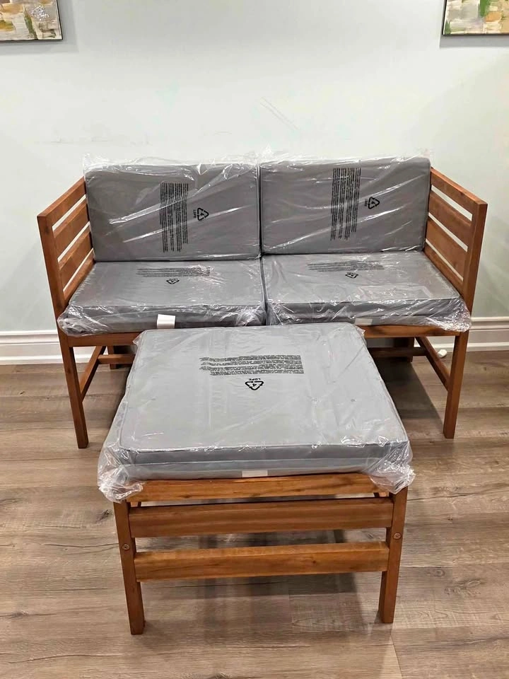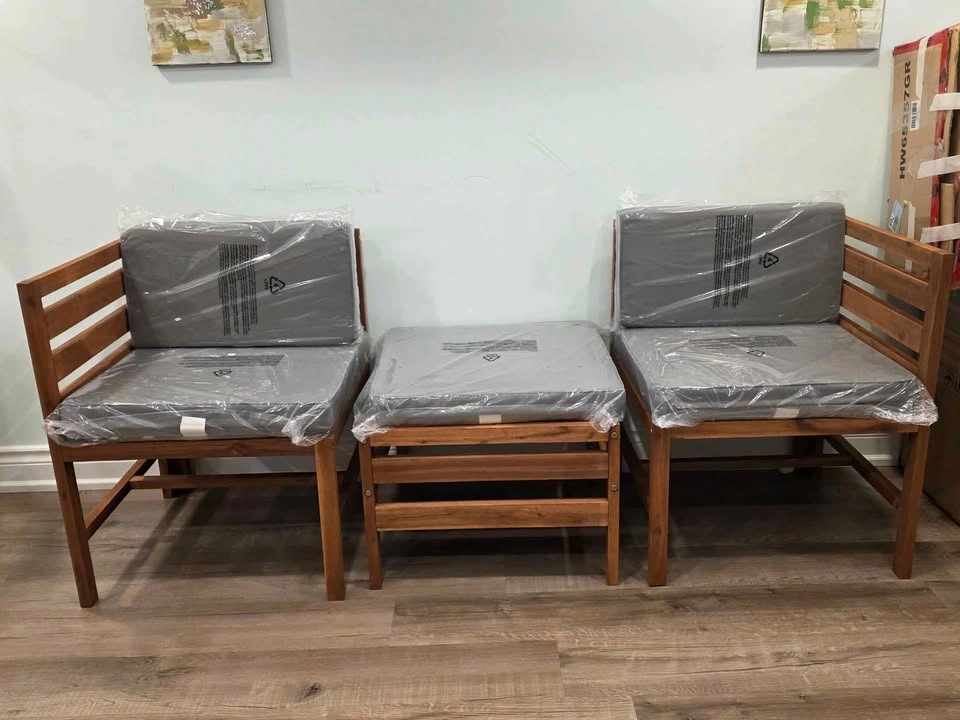 Beautiful and modern outdoor patio set featuring two corner chairs and one ottoman. Made with solid acacia wood in a brown finish and thick, comfortable weather-resistant cushions (grey). Stylish, durable, and space-saving – perfect for balconies, patios, or small backyard setups. Brand new, fully assembled – never used. Premium acacia wood frame for outdoor durability Comfortable foam-filled cushions still in original plastic Modular design lets you rearrange as needed Set includes: 2 corner chairs 1 ottoman 5 grey cushions (seat & back)