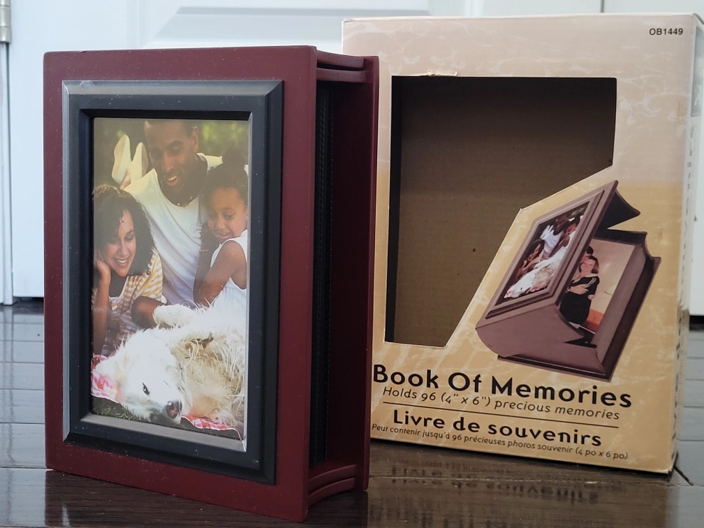Display your cherished memories in style with this Book Of Memories photo album, capable of holding 96 (4" x 6") precious photos. This unique album is designed to look like a book, featuring a photo frame on the cover, making it a delightful addition to any bookshelf or coffee table. The album is new, ready to safeguard your photographs for years to come.