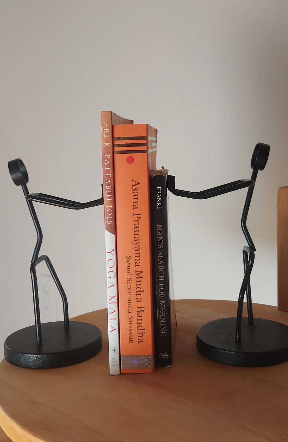 These are a pair of decorative bookends in black metal. They feature a unique stick figure design, adding a touch of whimsy to any bookshelf or desk. They are in great condition and ready to hold your favourite books! 20 cms HX 10 cms W