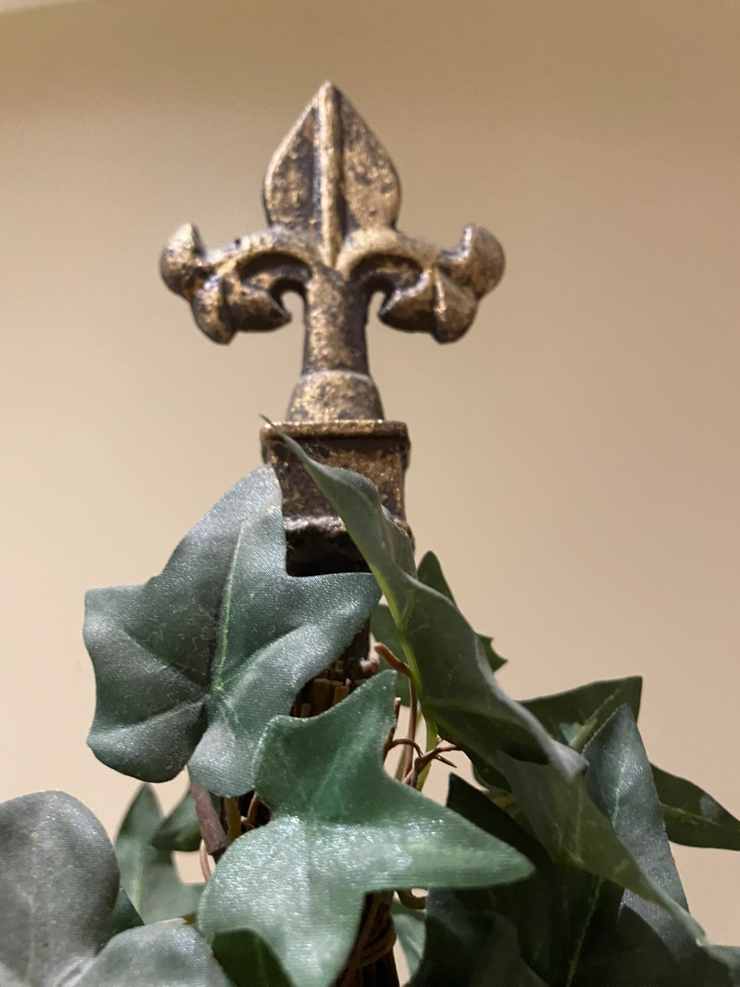 This is a charming artificial ivy topiary tree, perfect for adding a touch of greenery to your home! The tree features a spiral design and comes in a decorative wood pot. It's in good condition and ready to brighten up any space.