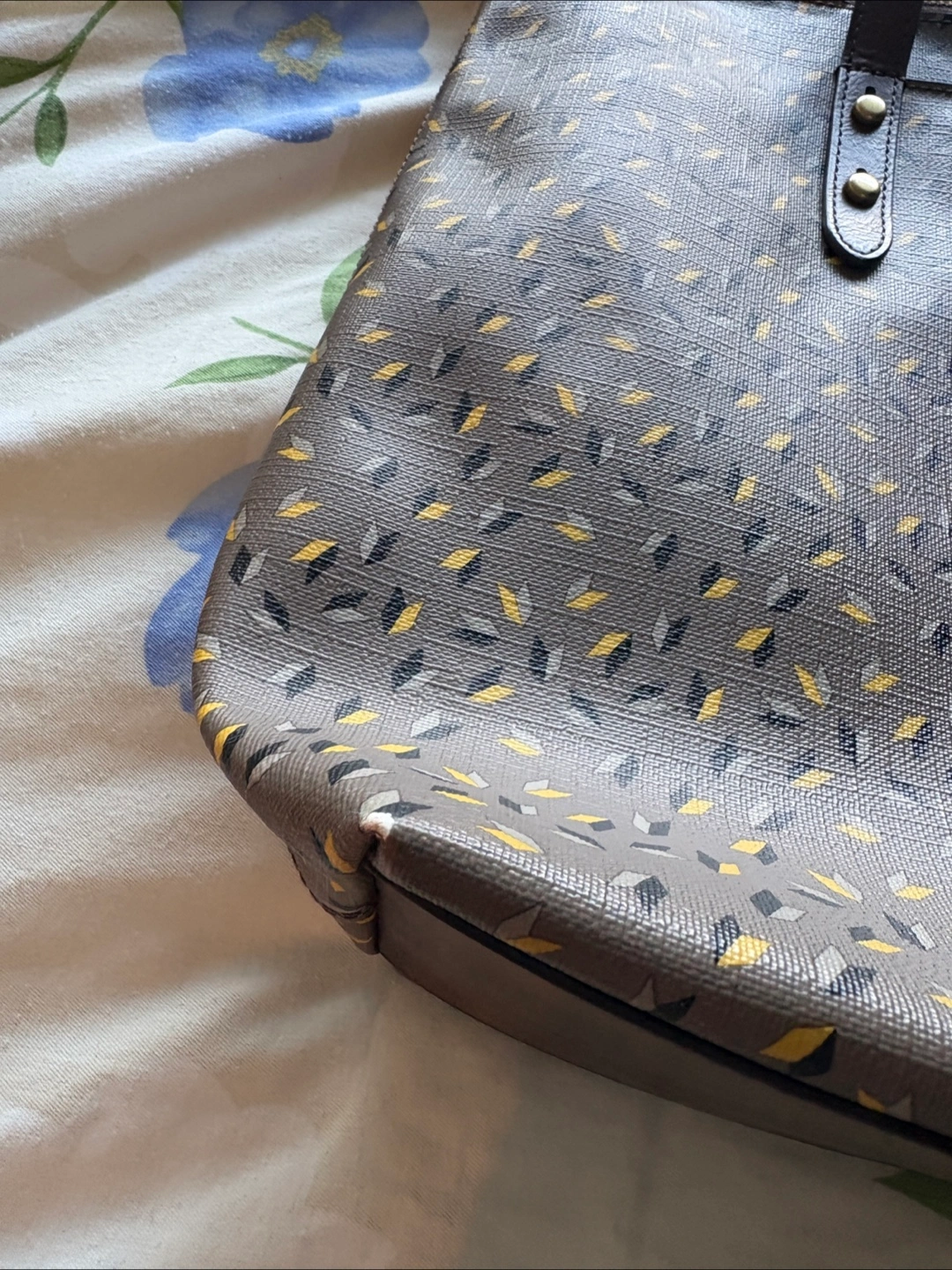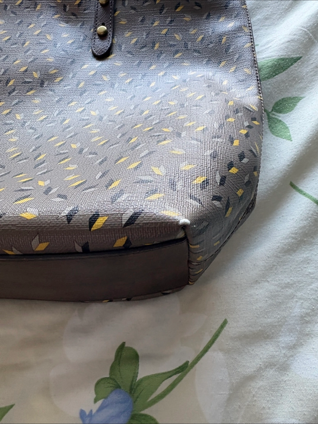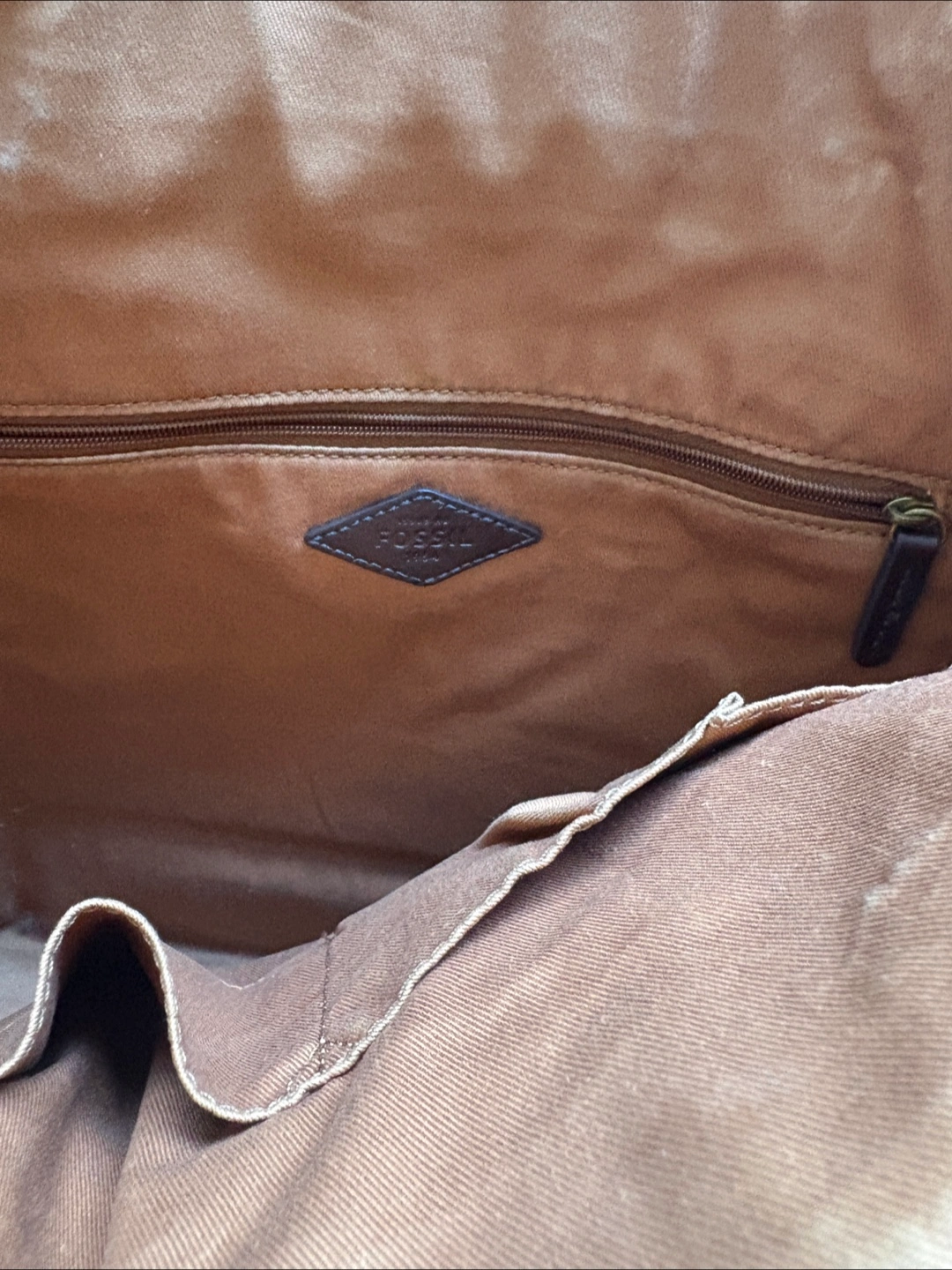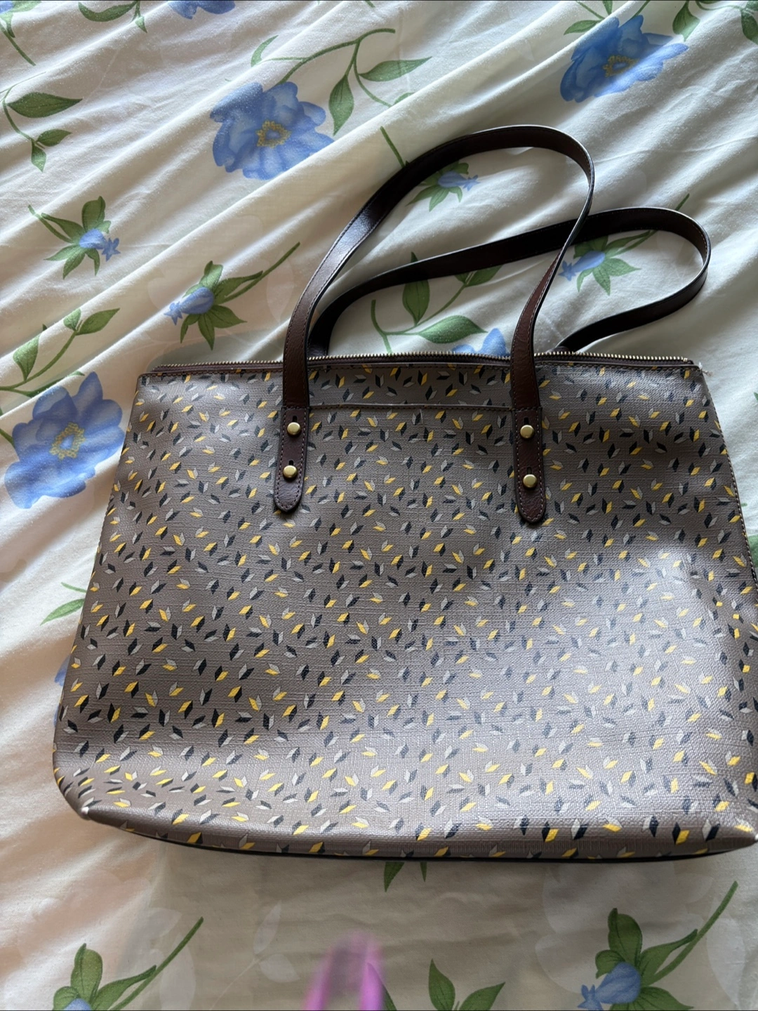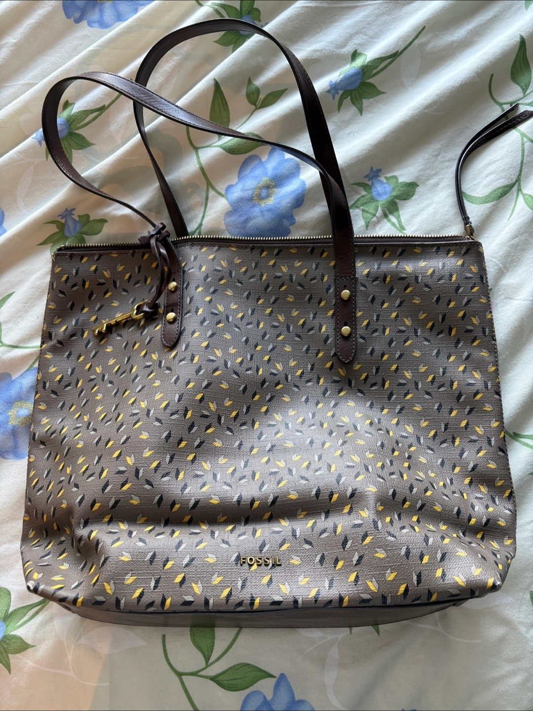 Selling a Fossil tote bag! It's a stylish and practical bag for everyday use. It has a zipper closure and a spacious interior. There are some signs of wear on the corners, as shown in the photos but not noticeably when using it