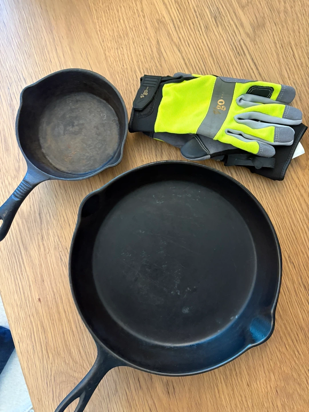 Selling a set of two cast iron skillets. They're well-seasoned and ready for all your cooking needs! The set includes one larger skillet and one small. The gloves are for scale.