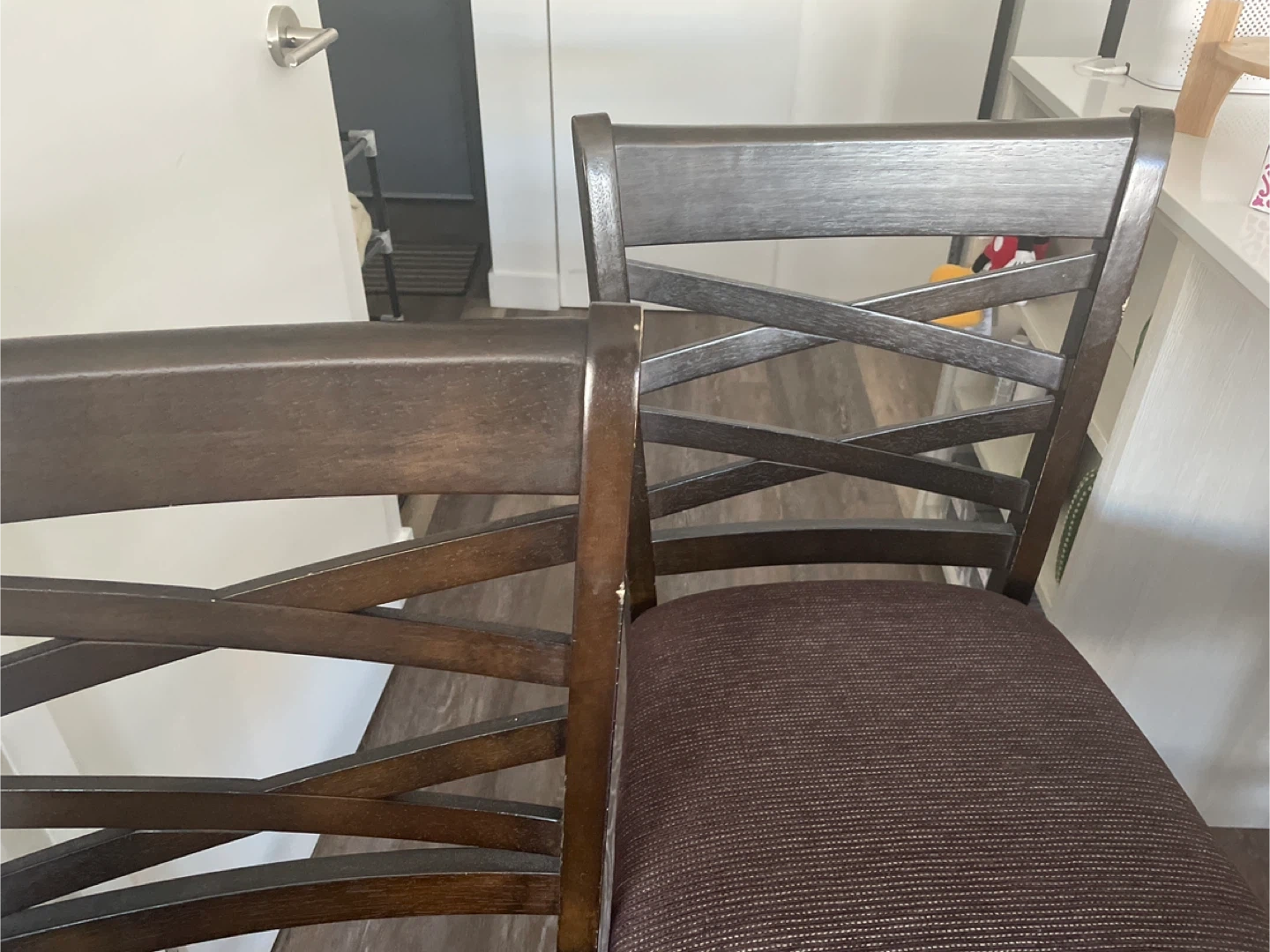 Selling a set of two bar stools! They're a dark brown wood with a padded seat. They'd be perfect for a kitchen island or bar area. They are in great condition and ready for a new home! 50 for 2 H 60 cm