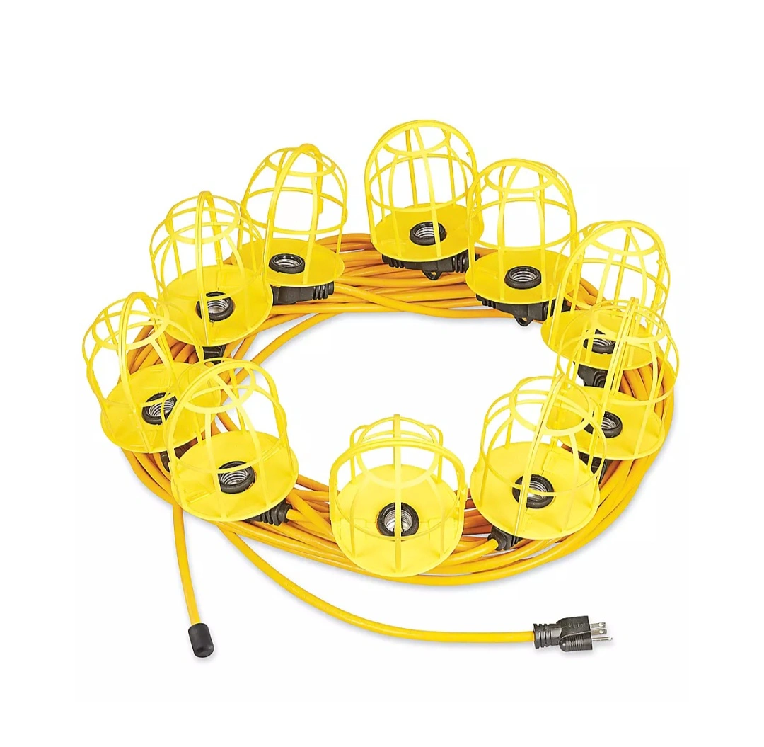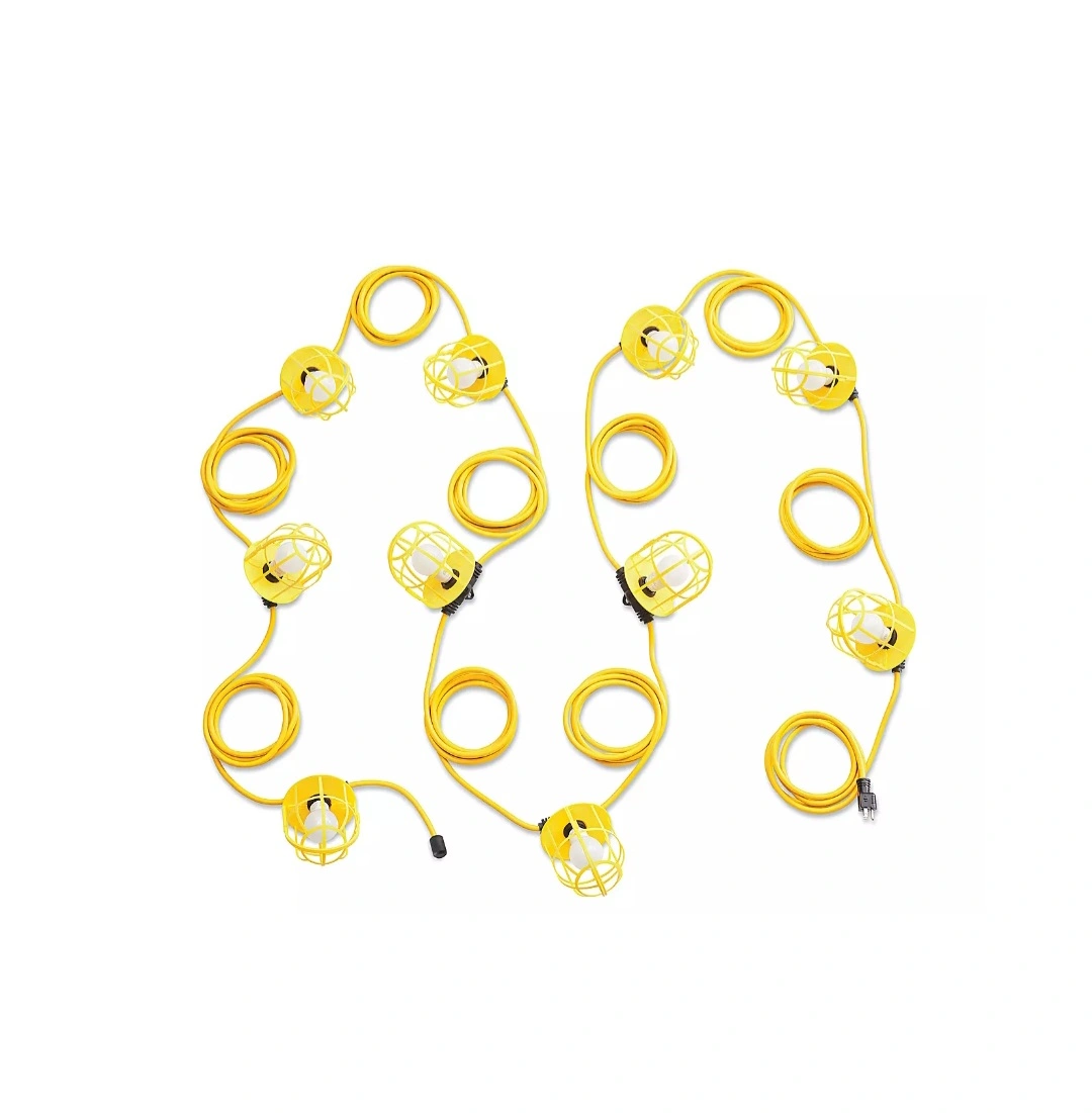 86Selling a string of work lights, perfect for any job site or workspace. These lights come with protective cages around each bulb, ensuring durability and safety. The bright yellow colour makes them easily visible.