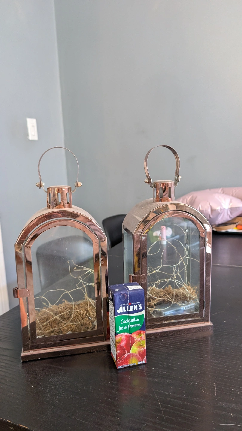 Selling a set of two decorative lanterns with a lovely copper finish. They would look great in any room or as part of a table setting. includes moss and fairy lights but not sure if the lights work they definitely need new batteries. juice box for size reference. Pickup only St Clair East and O'Connor