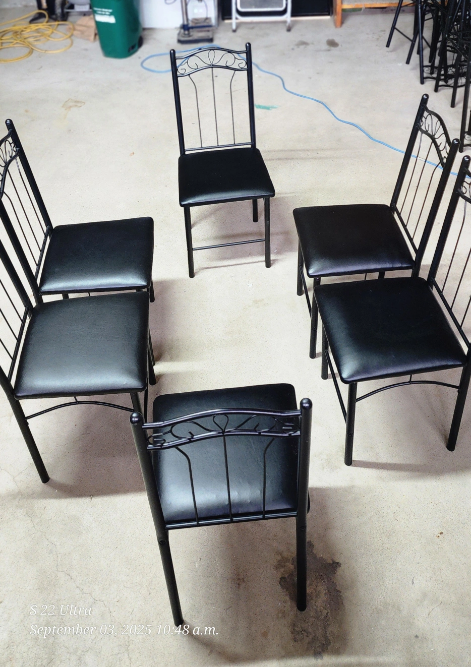 Selling a set of six black metal dining chairs with padded seats. They're in great shape and would look fantastic in any dining room or kitchen! The chairs have a decorative scroll design on the backrest, adding a touch of elegance. Perfect for family dinners or entertaining guests
