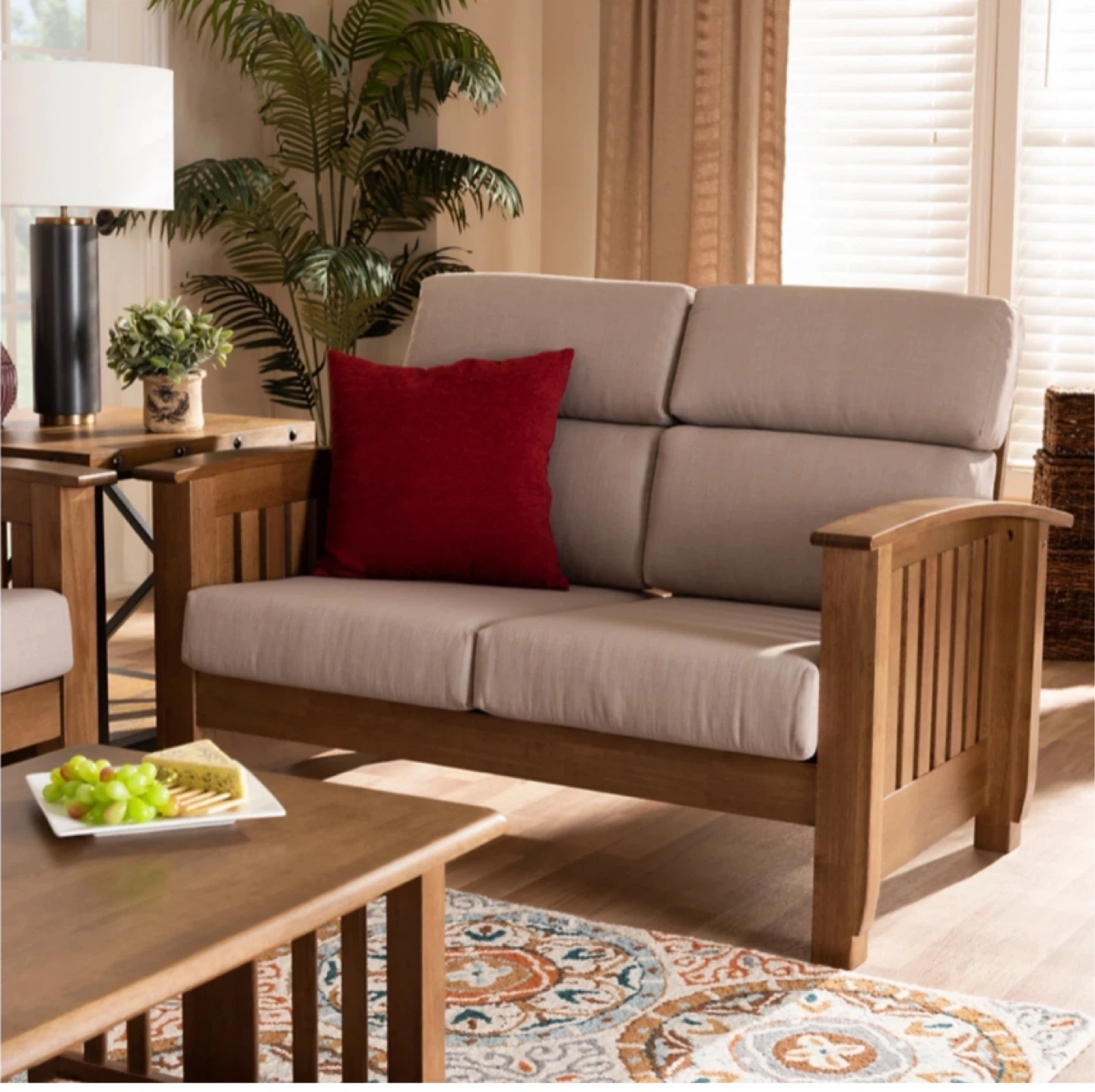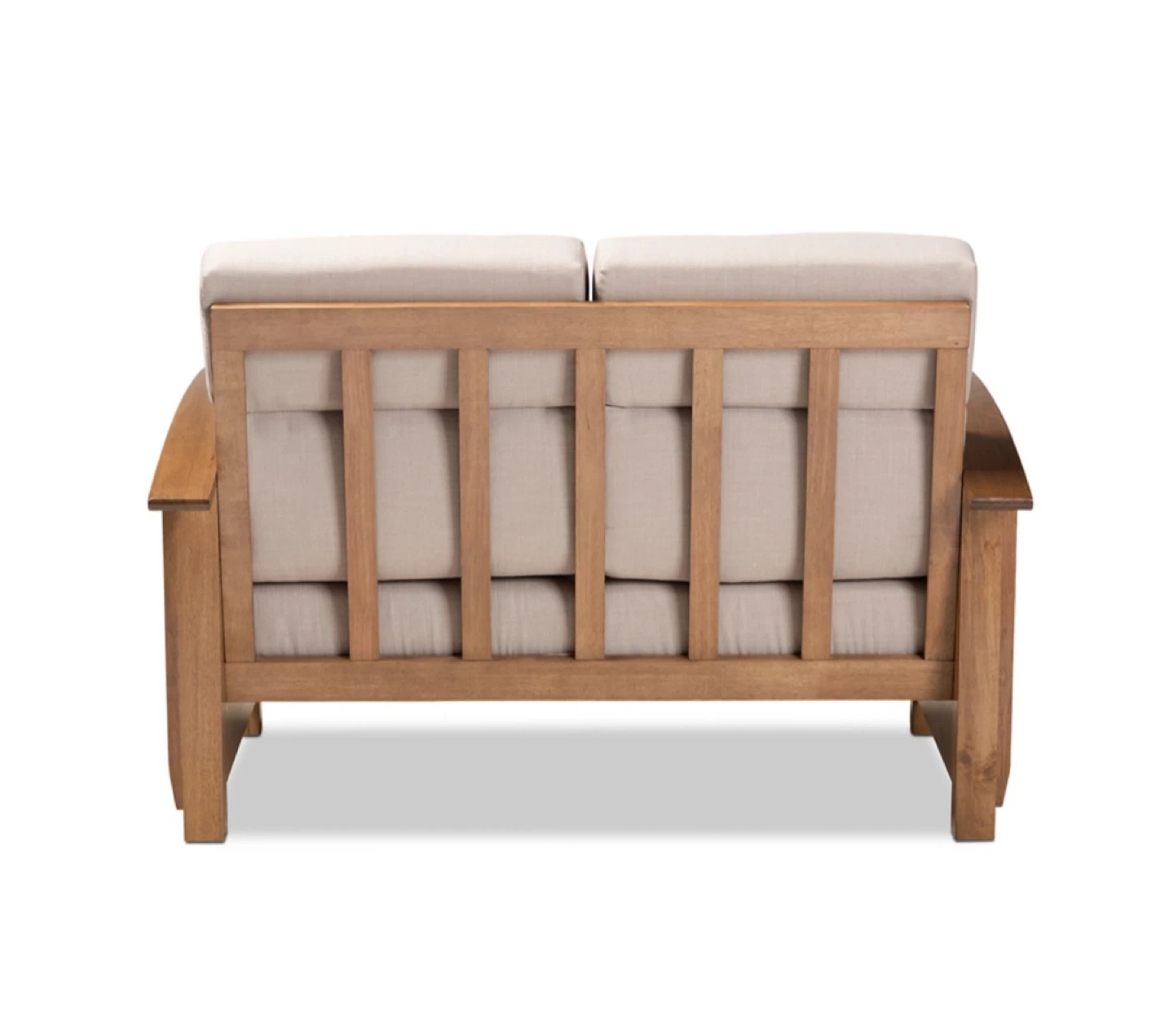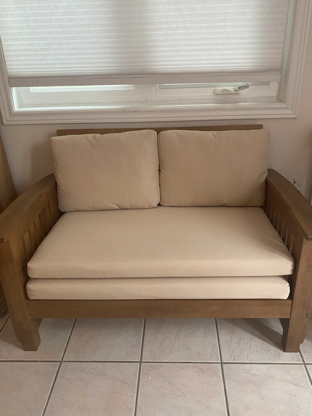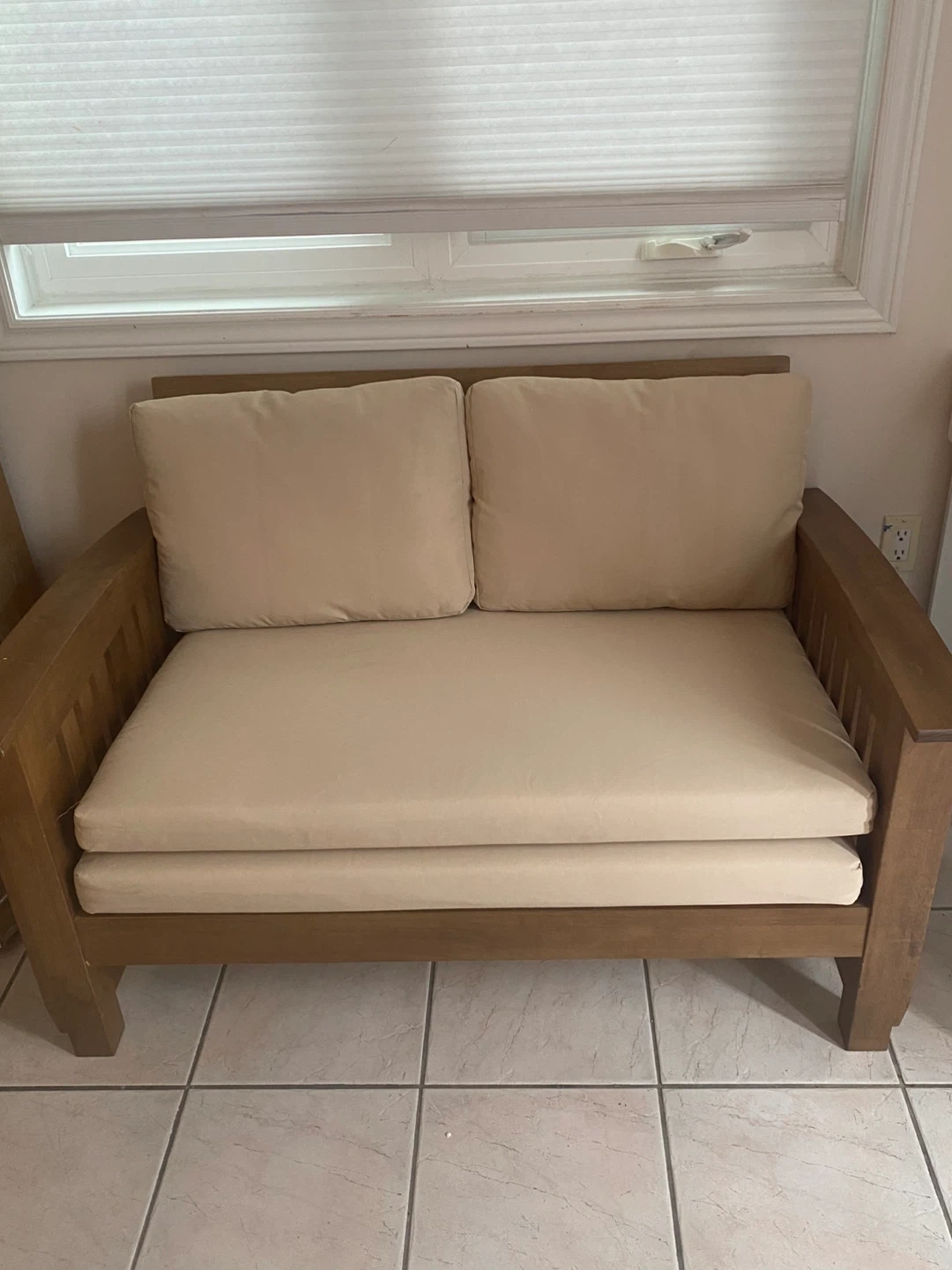 433A lovely loveseat featuring a solid wood frame and beige fabric cushions. It's in great shape and would look perfect in a living room or den. The neutral colours will match any decor!