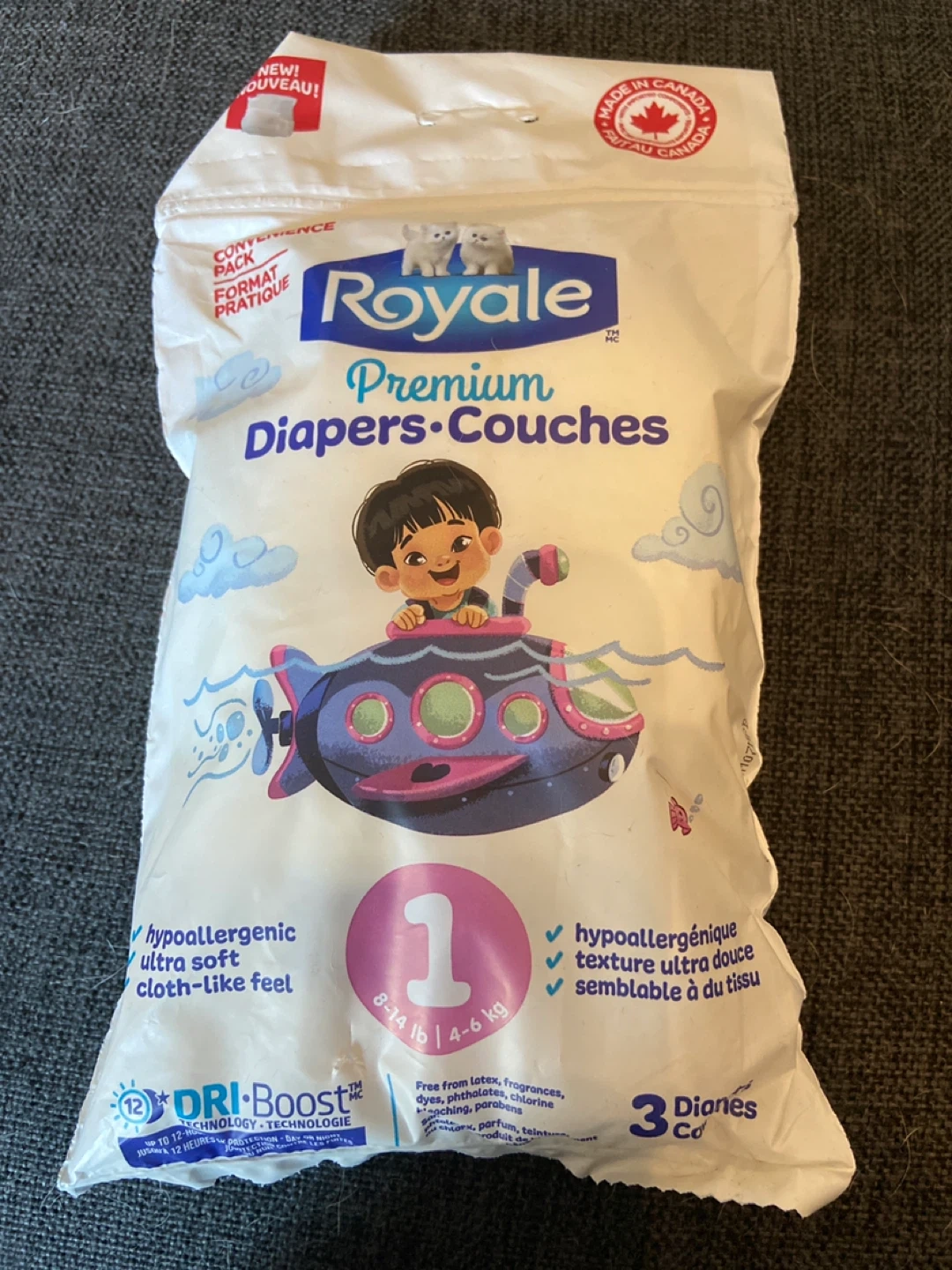 Giving away a 3 pack of Royale Premium Diapers, size 1 (8-14 lbs or 4-6 kg). These diapers have a hypoallergenic, ultra-soft cloth-like feel and are free from latex, fragrances, dyes, phthalates, chlorine bleaching, and parabens. Made in Canada!