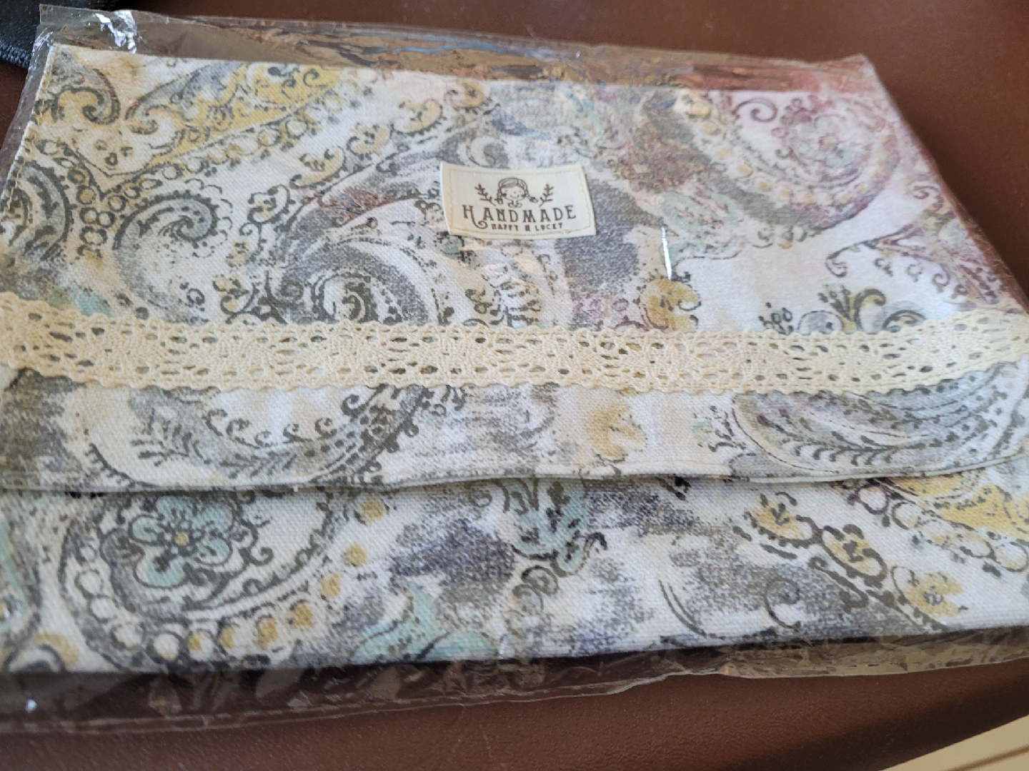 Selling a cute clutch from Handmade Happy & Lucky! It features a beautiful paisley pattern and a delicate lace trim. It's still in its original packaging, so it's in perfect condition!