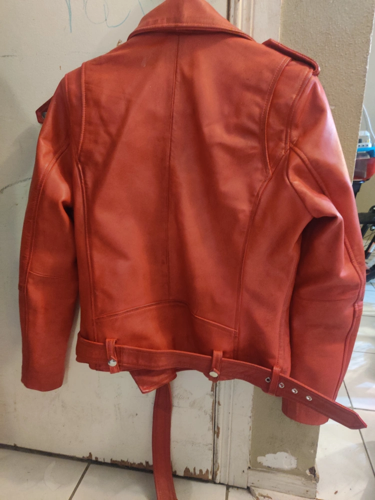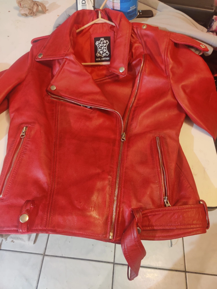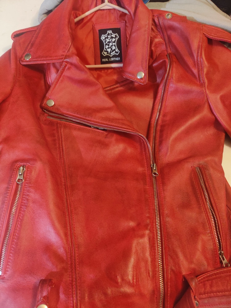 Selling a stylish red leather biker jacket. It's made of real leather and features a classic asymmetrical zip closure and belted waist. Perfect for adding a pop of colour to any outfit! To look at the picture you would think it's dirty but it's part of the design. Fastest pickup preferred.