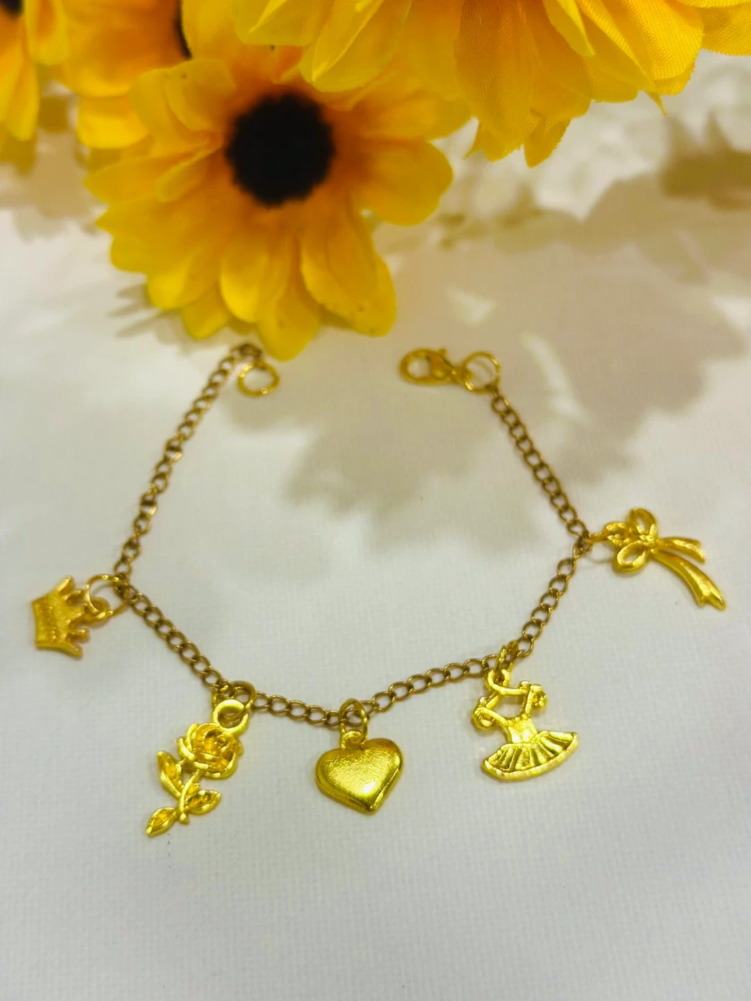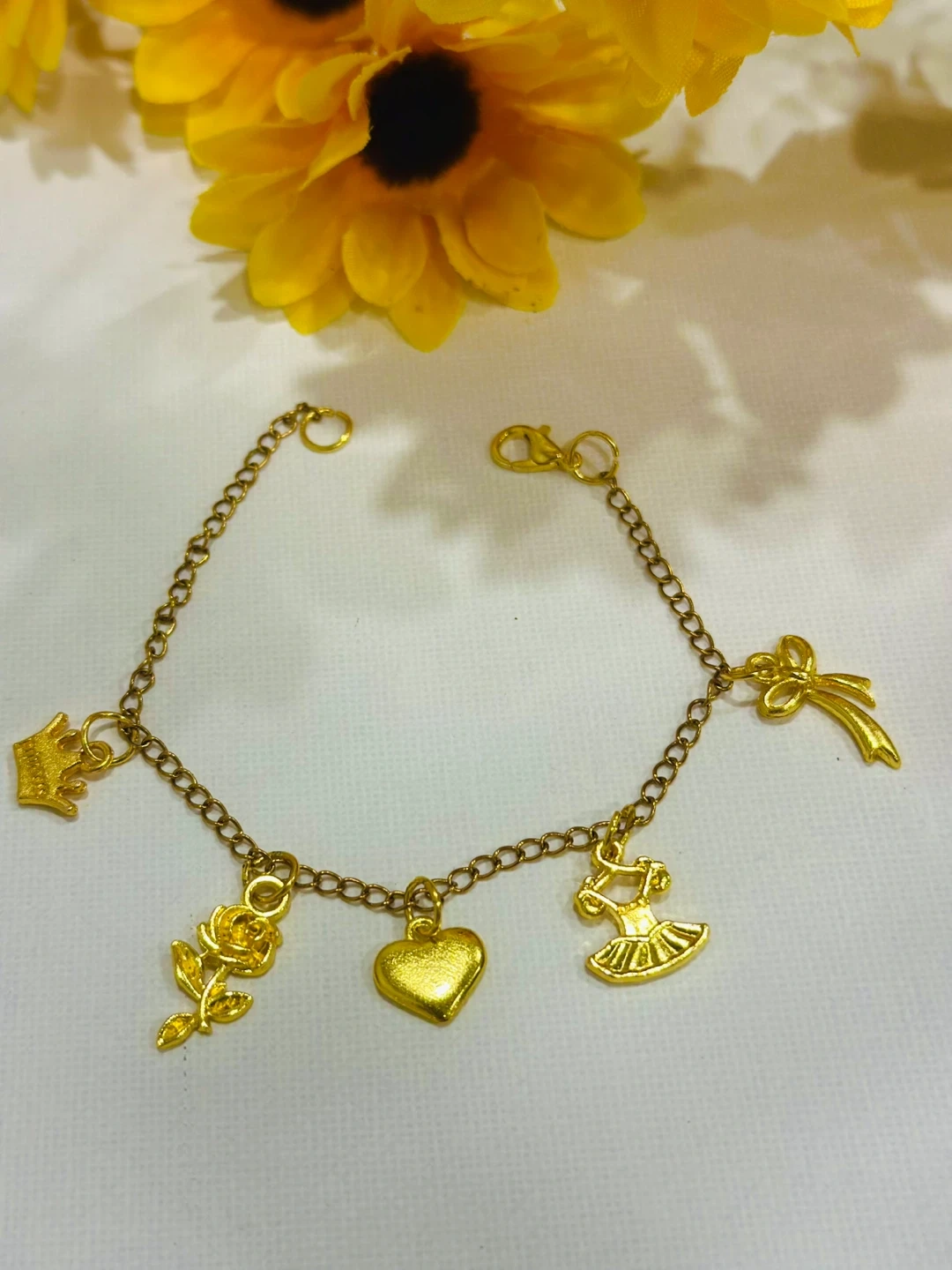 You can customize your own bracelet charm. Selling a cute gold charm bracelet! It features a variety of charms including a crown, rose, heart, dress, and bow. Perfect for adding a touch of whimsy to any outfit.