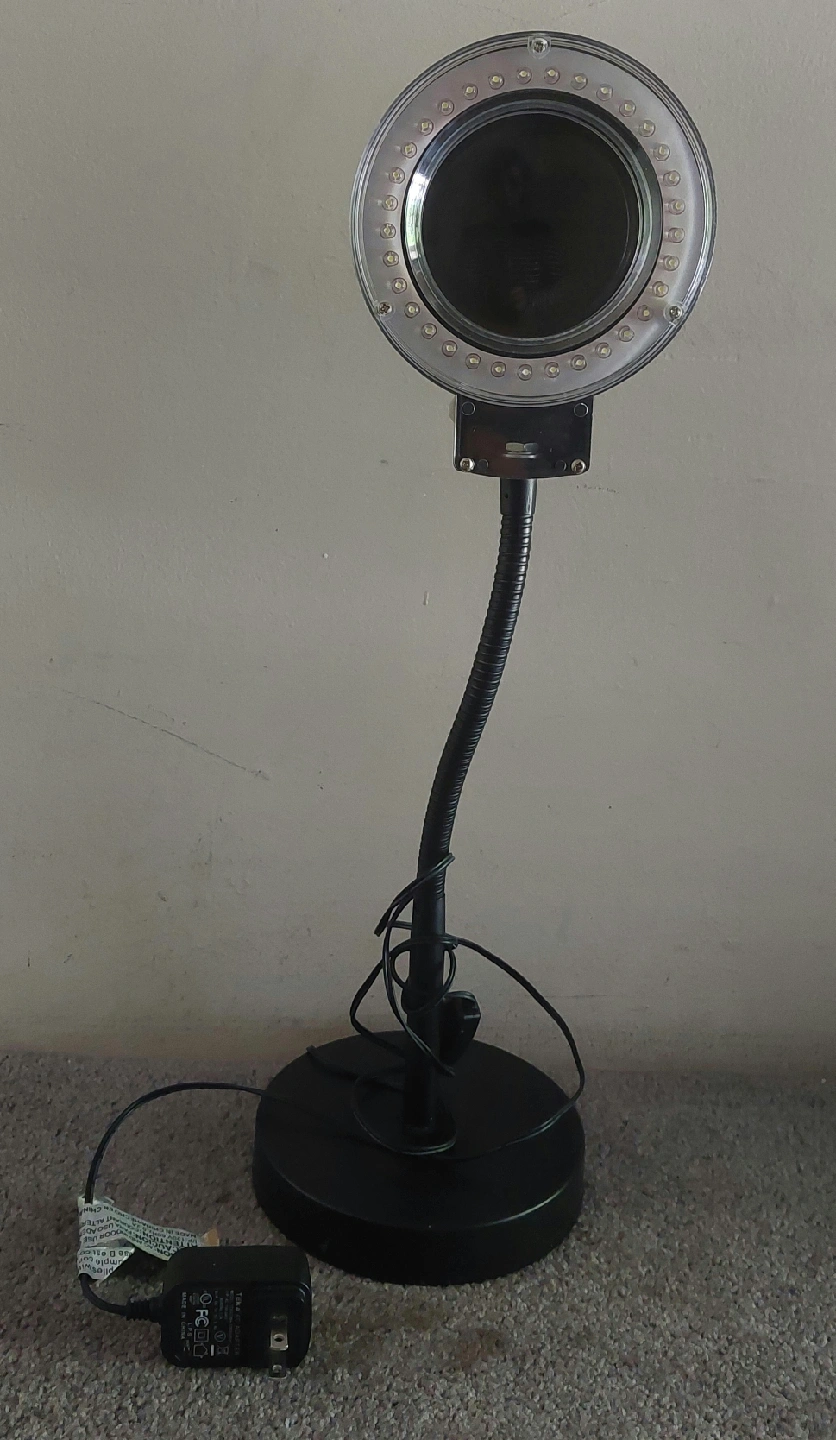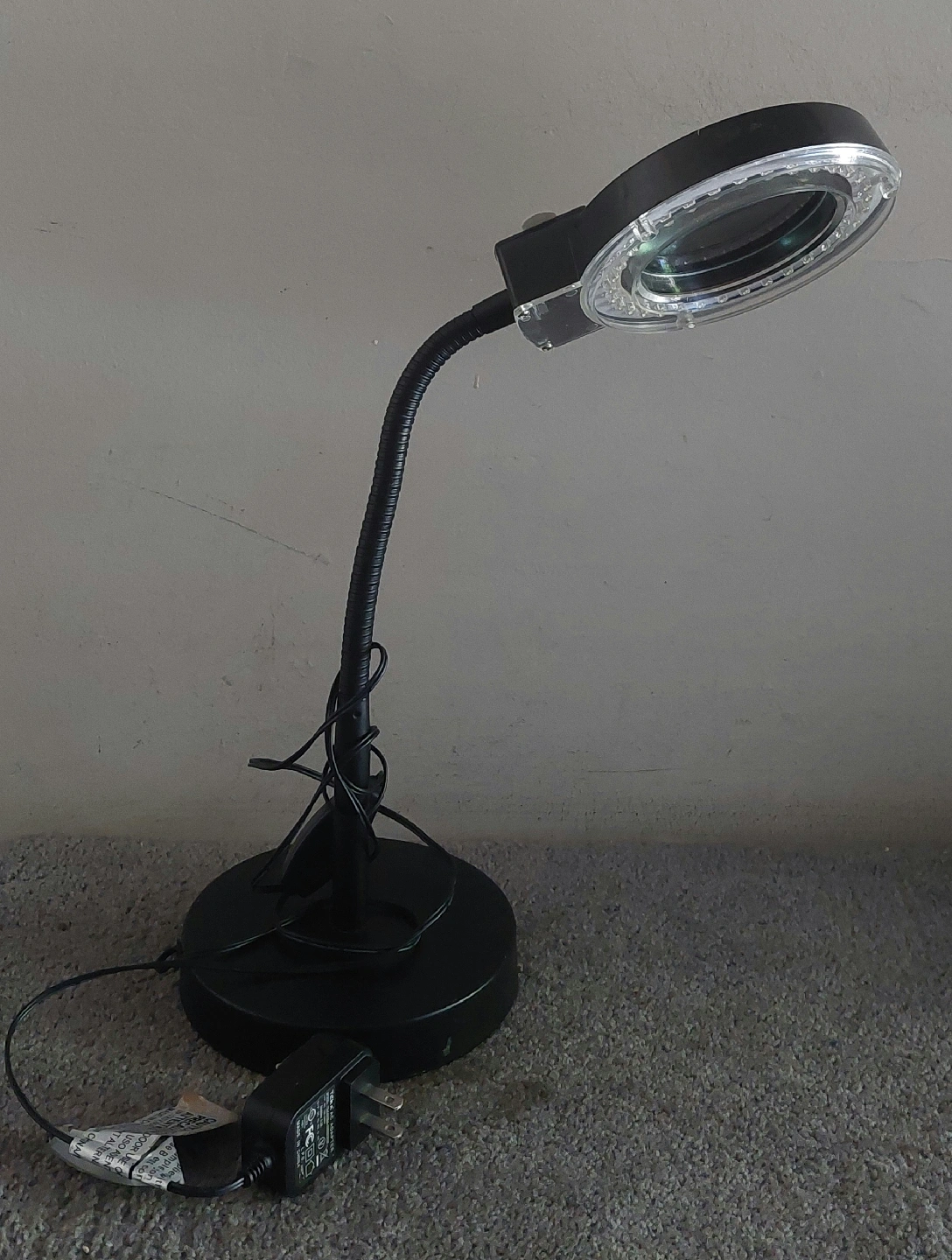 586Selling a black LED magnifying lamp. It's in great condition and perfect for detailed work or hobbies. It comes with a power adapter.