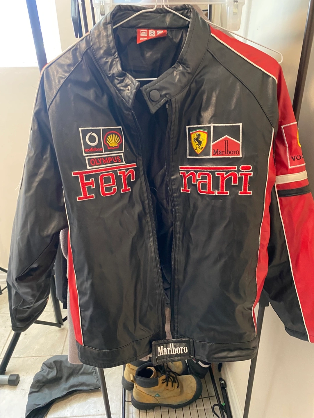 Selling a cool Ferrari racing jacket in black and red. It has logos for Vodafone, Shell, Olympus, and Marlboro. Perfect for any racing fan!