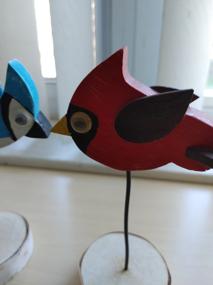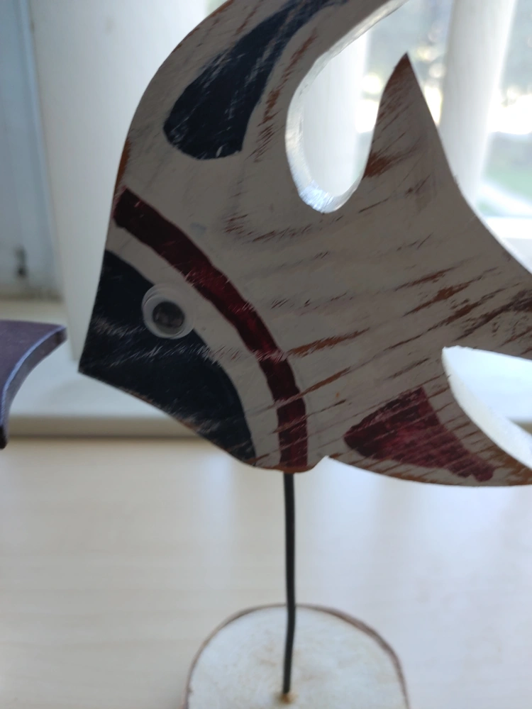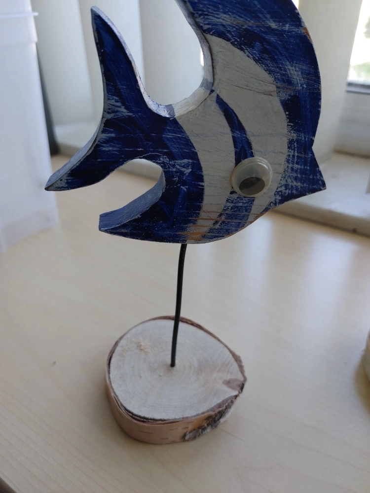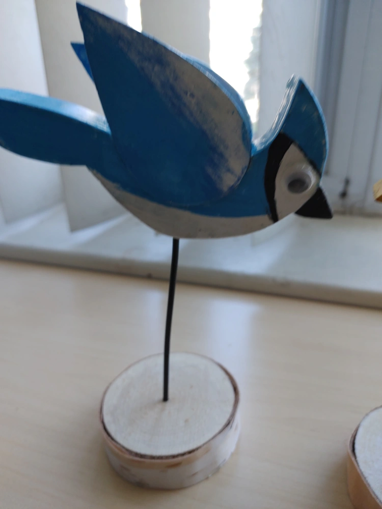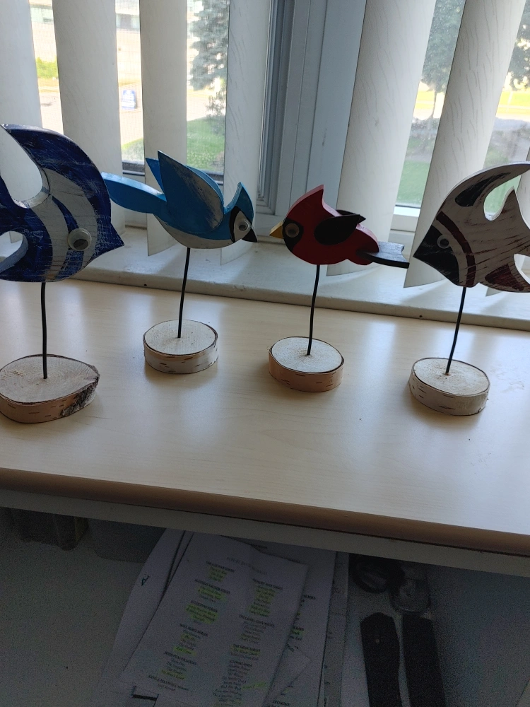 Check out these adorable handmade wooden figurines! There are two fish and two birds, each with a unique painted design. They're all mounted on small wooden bases, perfect for adding a touch of whimsy to any room